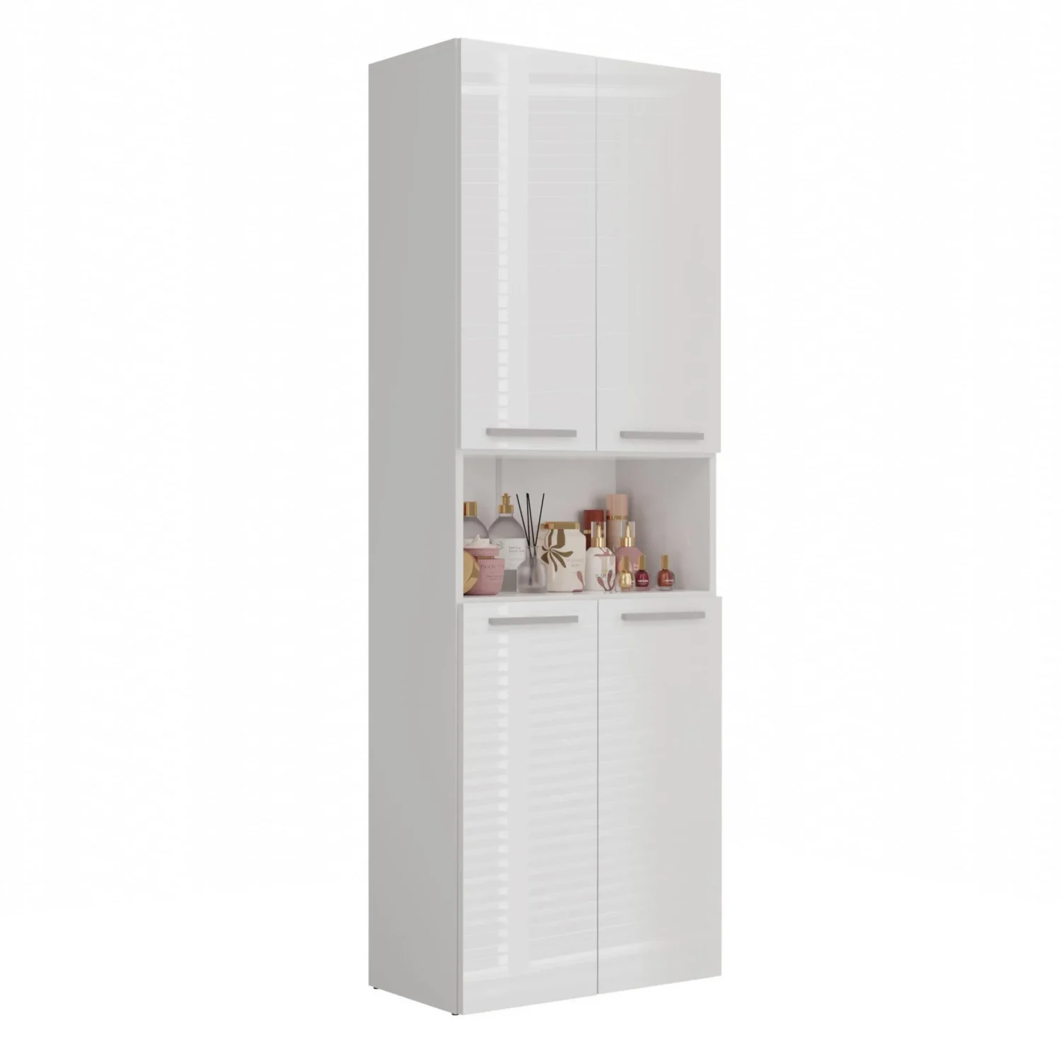 Unser Badezimmerschrank bietet bis zu fünf praktische Einlegeböden, von denen vier abschließbar sind und einer offen bleibt. Ideal für alle, die Wert auf Ordnung legen und das Wesentliche hinter eleganten Türen verstecken wollen, während auf dem offenen Regal dekorative Akzente gesetzt werden.