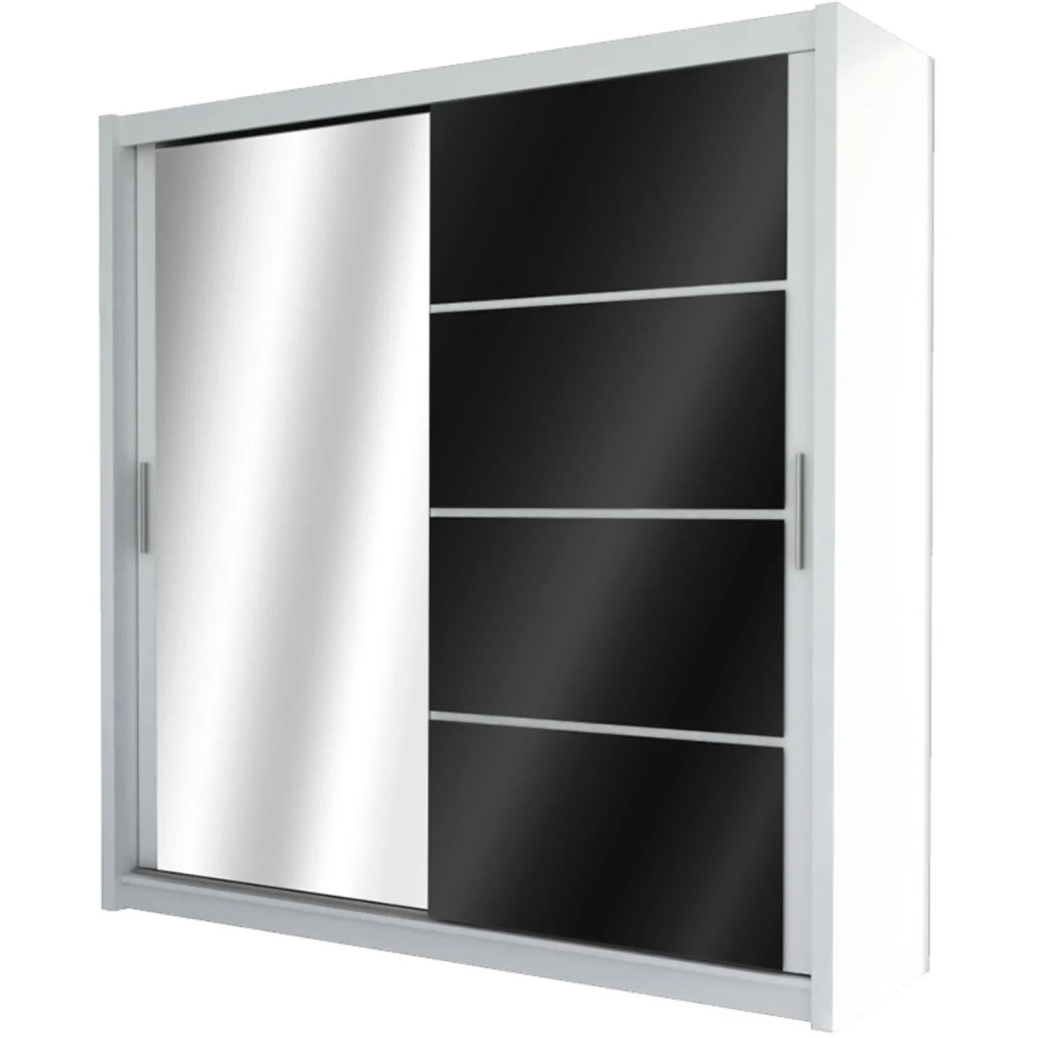 Sind Sie auf der Suche nach einem Kleiderschrank, der den Platz in Ihrem Zimmer aufräumt und gleichzeitig eine stilvolle Ergänzung zu Ihrer Einrichtung darstellt? Wir haben die perfekte Lösung für Sie – unseren verschiebbaren Kleiderschrank Brandon mit Spiegel! Die Kombination der Farbe des weißen Korpus mit der schwarzen Front sorgt für einen modernen und eleganten Look. Eine Kombination, die Ihrer Raumgestaltung mit Sicherheit Charakter verleiht. Unser Kleiderschrank ist in zwei verschiedenen Größen erhältlich, so dass Sie die richtige Größe für Ihre Bedürfnisse wählen können – 150 cm und 203 cm. Durch die verspiegelten Schiebetüren haben Sie den vollen Überblick über Ihre Figur, während der geräumige Alkoven Ihnen die Möglichkeit gibt, viele Dinge zu verstauen – von Kleidung bis hin zu Accessoires und Zubehör. Schaffen Sie einen perfekt organisierten Raum und verleihen Sie Ihrem Zimmer einen einzigartigen Stil mit unserem verschiebbaren Kleiderschrank mit Spiegel!