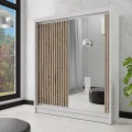 Das Besondere an diesem Modell sind die markanten senkrechten Lamellen in edler handwerklicher Eichenfarbe, die der weißen Oberfläche einen einzigartigen Charakter verleihen. Innen bietet der Schrank großzügigen Platz mit Regalen und einer Kleiderstange, perfekt zum Aufbewahren von Kleidung, Schuhen und Accessoires.