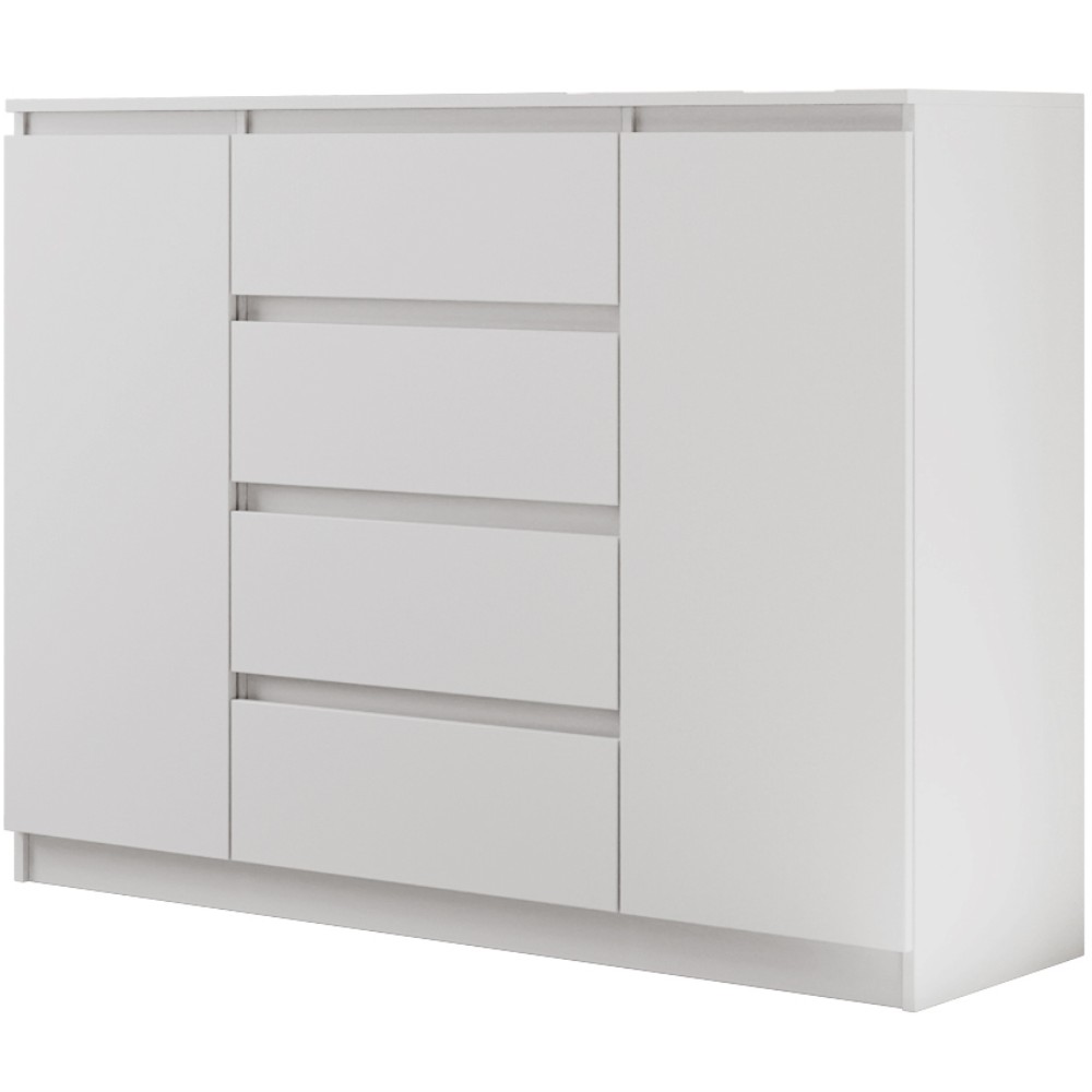 Die Kommode LINDA mit 4 Schubladen und 2 Türen überzeugt durch ihr modernes, zeitloses Design und bietet zugleich großzügigen Stauraum.