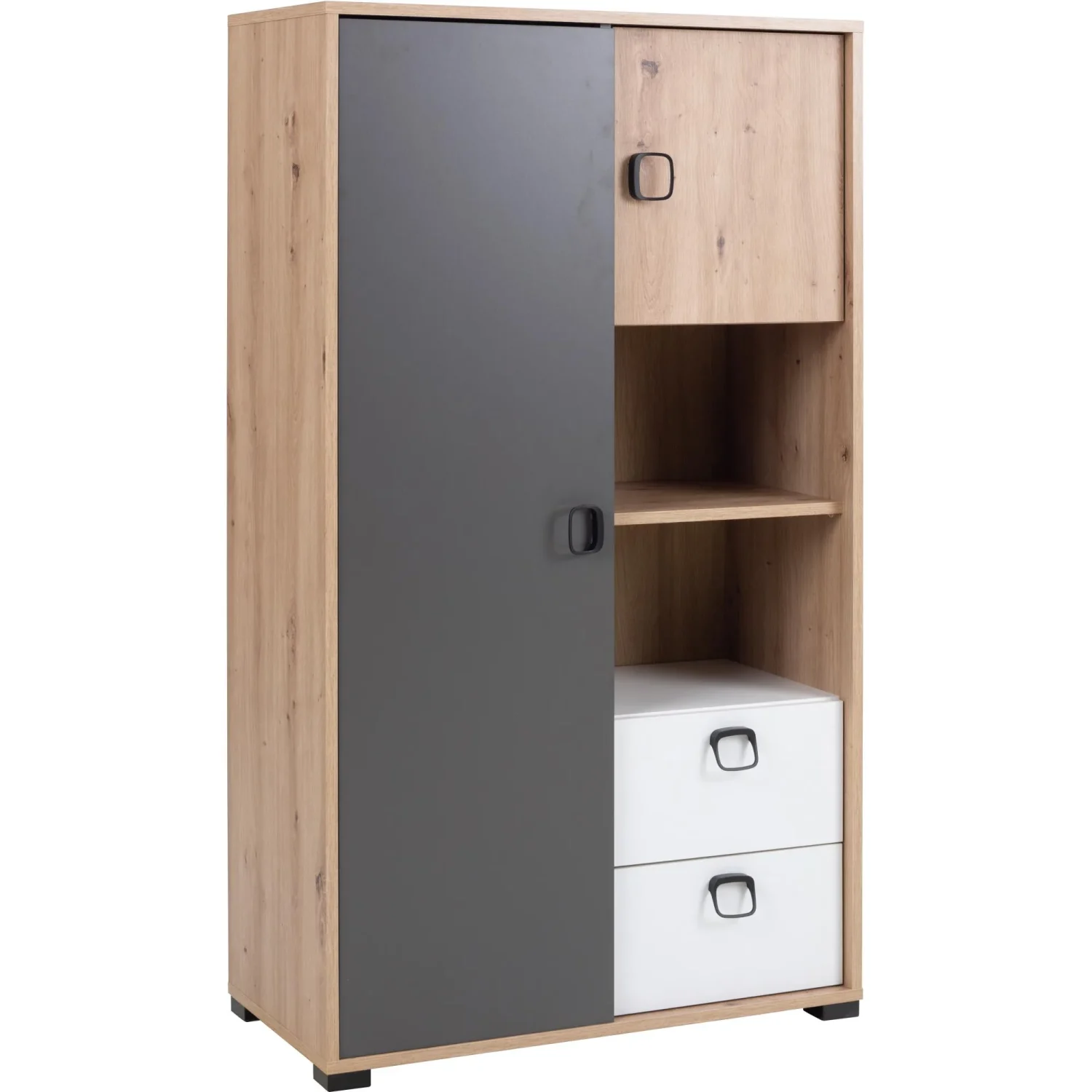 - Das Bücherregal besticht durch seine dreifarbige Ausführung in Weiß, Graphit und Eiche Artisan, die eine harmonische und moderne Ästhetik schafft. Sein minimalistisches Design und seine robuste Konstruktion machen es zu einer perfekten Ergänzung für eine Vielzahl von jugendlichen Einrichtungsstilen.