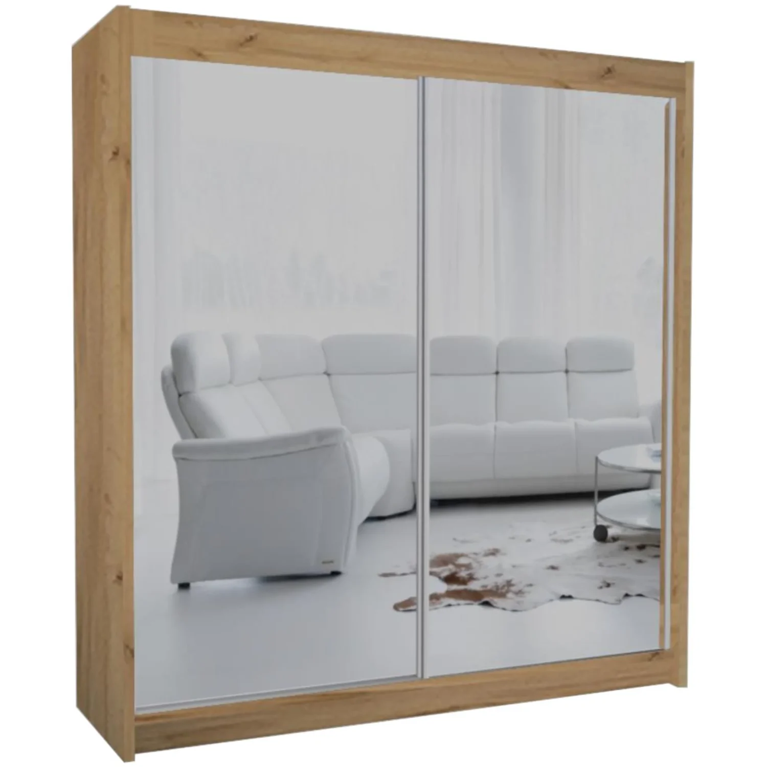 Suchen Sie einen Schiebetürenschrank zum Aufbewahren von Kleidung oder Garderobe? Der Schrank Debra wird Ihre Erwartungen perfekt erfüllen! Kleiderschrank mit einer Breite von 120 cm, 150 cm, 180 cm, 200 cm oder 240 cm, aus 16 mm starker Laminatplatte und ABS-Furnier. Der Garderobenschrank Debra verwendet das Schiebesystem „Laguna“, das über Aluminiumführungen. Alle Fronten sind mit einem “OMEGA 2R”-Griff aus Aluminium und einer Kotflügelbürste versehen. Zwei Schiebetüren mit Spiegeln des Kleiderschranks Debra vergrößern optisch den Raum und verleihen dem Innenraum Eleganz. Je nach Größe verfügt der Debra Kleiderschrank über mehrere Einlegeböden und Kleiderstangen.