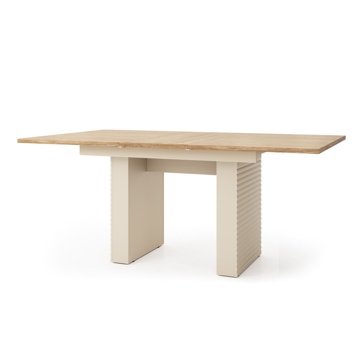 Dank der Ausziehfunktion lässt sich der Tisch im Handumdrehen von 140 cm auf 185 cm verlängern – ideal, wenn Sie Gäste empfangen oder mehr Platz beim Essen benötigen. Die Einlegeplatte wird praktisch im Inneren des Tisches aufbewahrt, sodass sie immer griffbereit ist und kein zusätzlicher Stauraum nötig ist. Damit passt sich der Tisch mühelos Ihren Bedürfnissen an – vom Familienalltag bis zum festlichen Anlass.