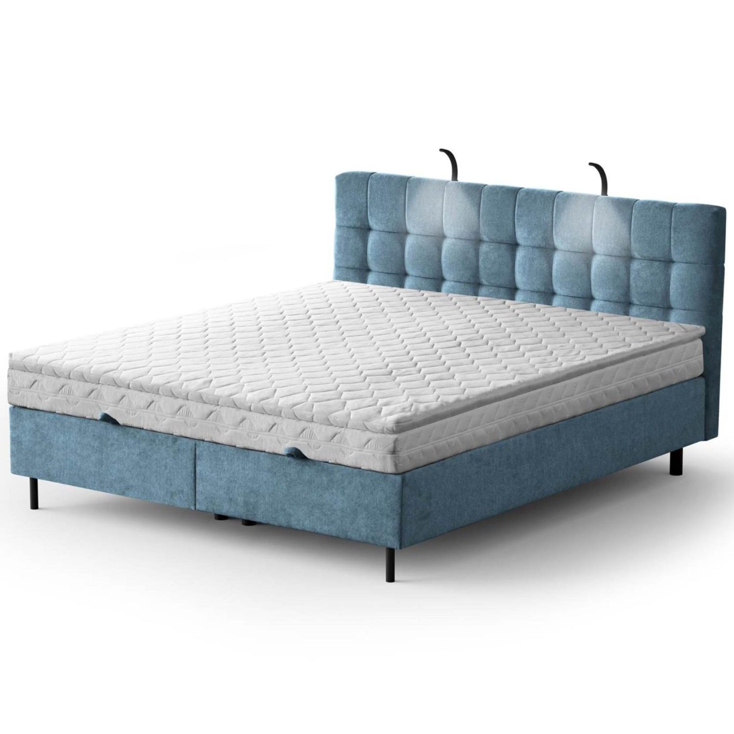 Das mit Veloursstoff gepolsterte Bett – Muna – passt perfekt in Ihr Schlafzimmer. Der Preis beinhaltet Pocket Matratze 17 cm und Topper 4 cm aus Polyurethanschaum T25. Kopfteile aus gesteppten Paneelen, die Ihrem Schlafzimmer Eleganz verleihen. Über dem Kopfteil sind zwei Metalllampen mit verstellbarer Position und USB-Aufladung angebracht, die das Lesen vor dem Schlafengehen erleichtern oder dem Raum am Abend eine Atmosphäre verleihen. Das Polsterbett Muna ist mit einem Bettkasten ausgestattet, der mit Gasliftern geöffnet werden kann. Der Bettrahmen ist aus Holz gebaut, während die Beine aus schwarzen Metallrollen bestehen, dank denen der Bettkörper äußerst angenehm aussieht. In 13 verschiedenen Aston Veloursfarben erhältlich.