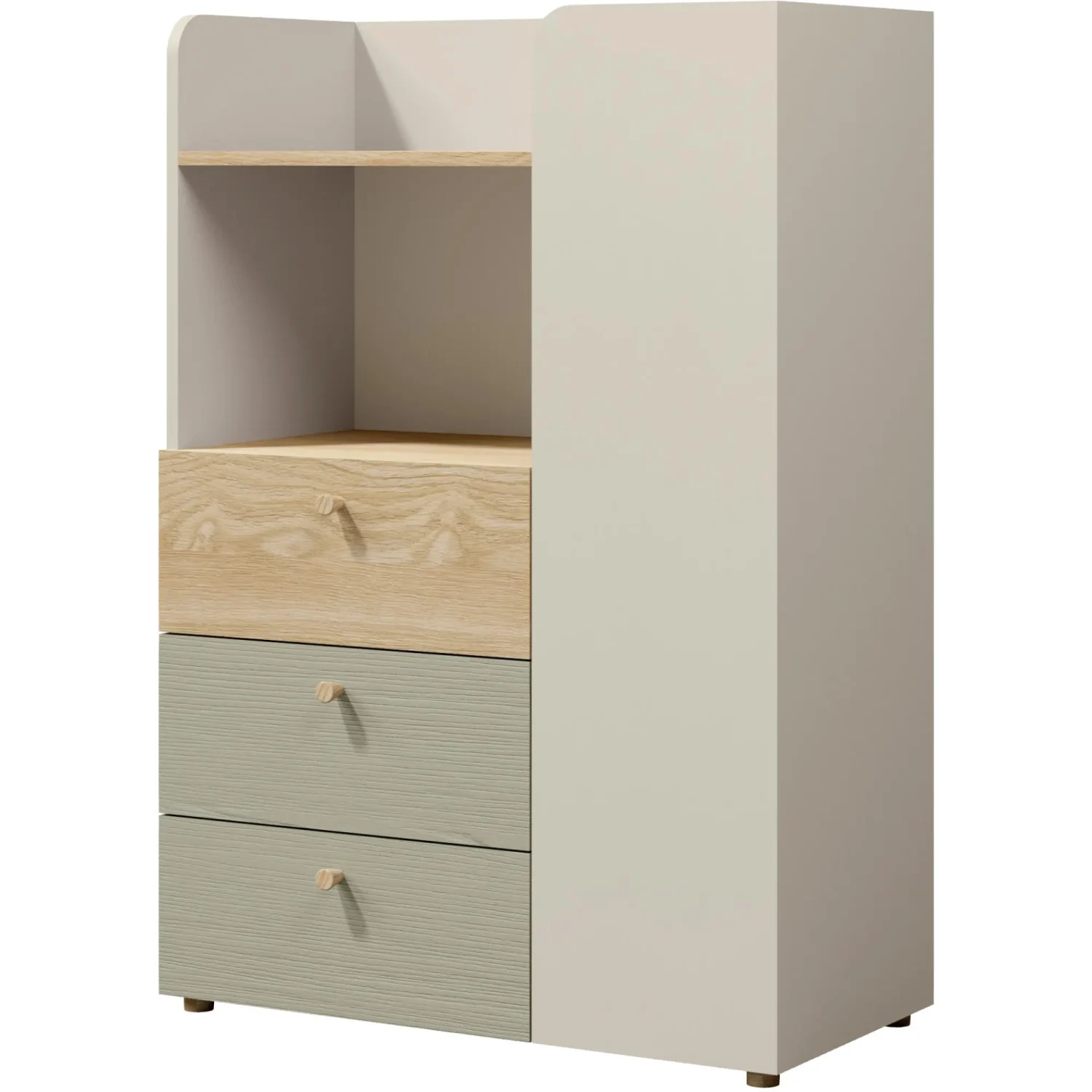 Der Bücherregal Yogi 07 hat einen Schrank, 3 Schubladen, ein praktisches Regal und eine Nische.