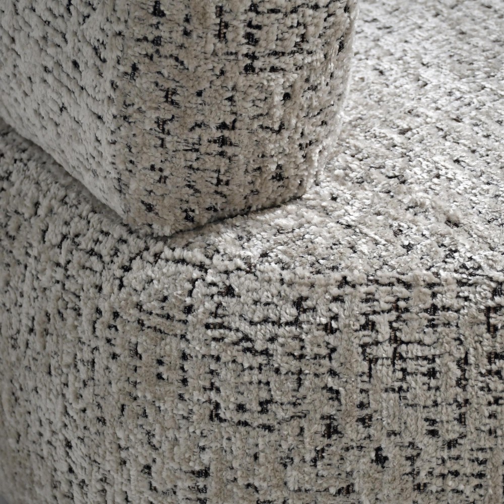 Der Sessel LAILA ist mit dem außergewöhnlichen Stoff RIMBA mit deutlich sichtbarer, geflochtener Struktur bezogen, die dem Möbelstück Charakter und Eleganz verleiht. Die strukturierte Oberfläche reflektiert das Licht auf elegante Weise, erzeugt einen subtilen Tiefeneffekt und unterstreicht die moderne, weiche Form des Sessels.