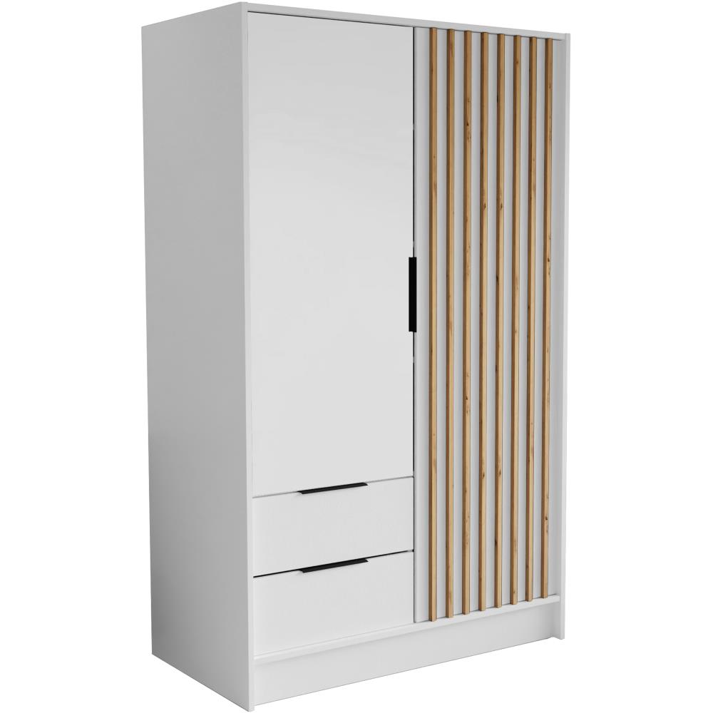 Das Innere des Kleiderschranks wurde sorgfältig entworfen, um eine Vielzahl von Aufbewahrungsbedürfnissen zu erfüllen. Zwei geräumige Schubladen, funktionale Einlegeböden und eine praktische Kleiderstange ermöglichen es Ihnen, Ihre Kleidung und Accessoires geschickt zu organisieren und aufzubewahren.