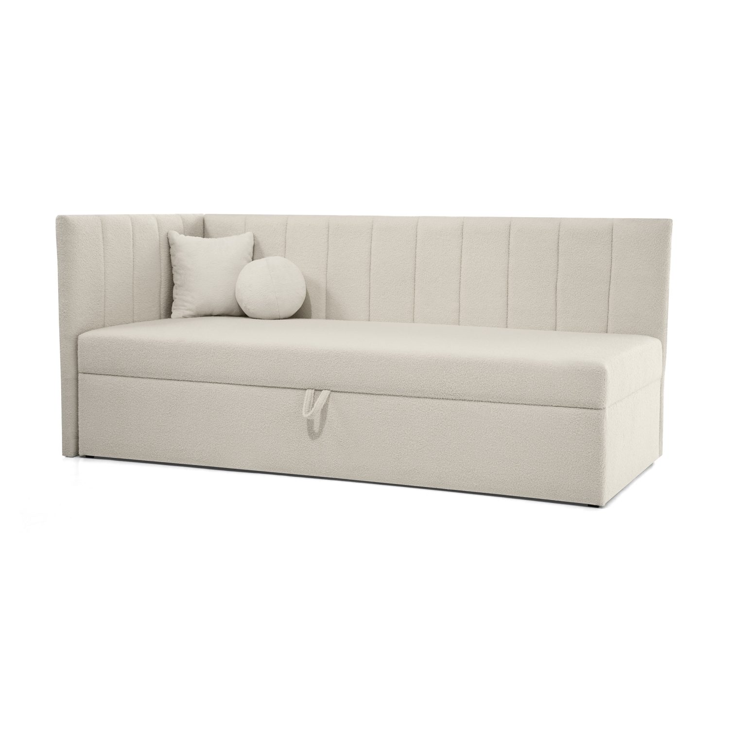 Das Eckbett RAFI 90×200 ist die perfekte Wahl für alle, die Komfort, Funktionalität und stilvolles Design in einem Möbelstück vereinen möchten. Durch seine kompakte Eckform eignet es sich ideal für kleinere Räume, während der weiche Bouclé-Stoff Quelle dem Bett einen modernen und gemütlichen Charakter verleiht.
