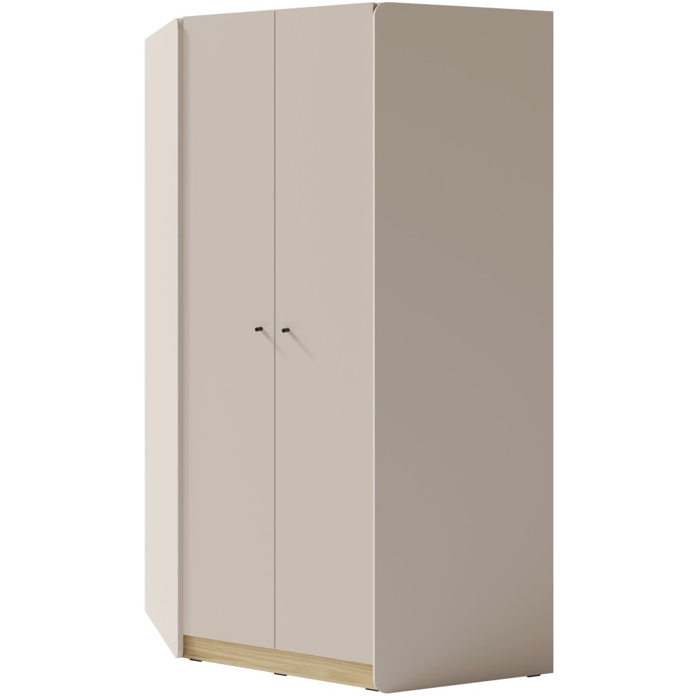 Optisch überzeugt der Eckkleiderschrank durch sein klares, modernes Design. Erhältlich in den trendigen Farben Eukalyptus oder Sandbeige, fügt er sich harmonisch in verschiedene Einrichtungsstile ein. Die schwarzen, minimalistischen Griffe setzen dezente Akzente und unterstreichen den zeitgemäßen Look.