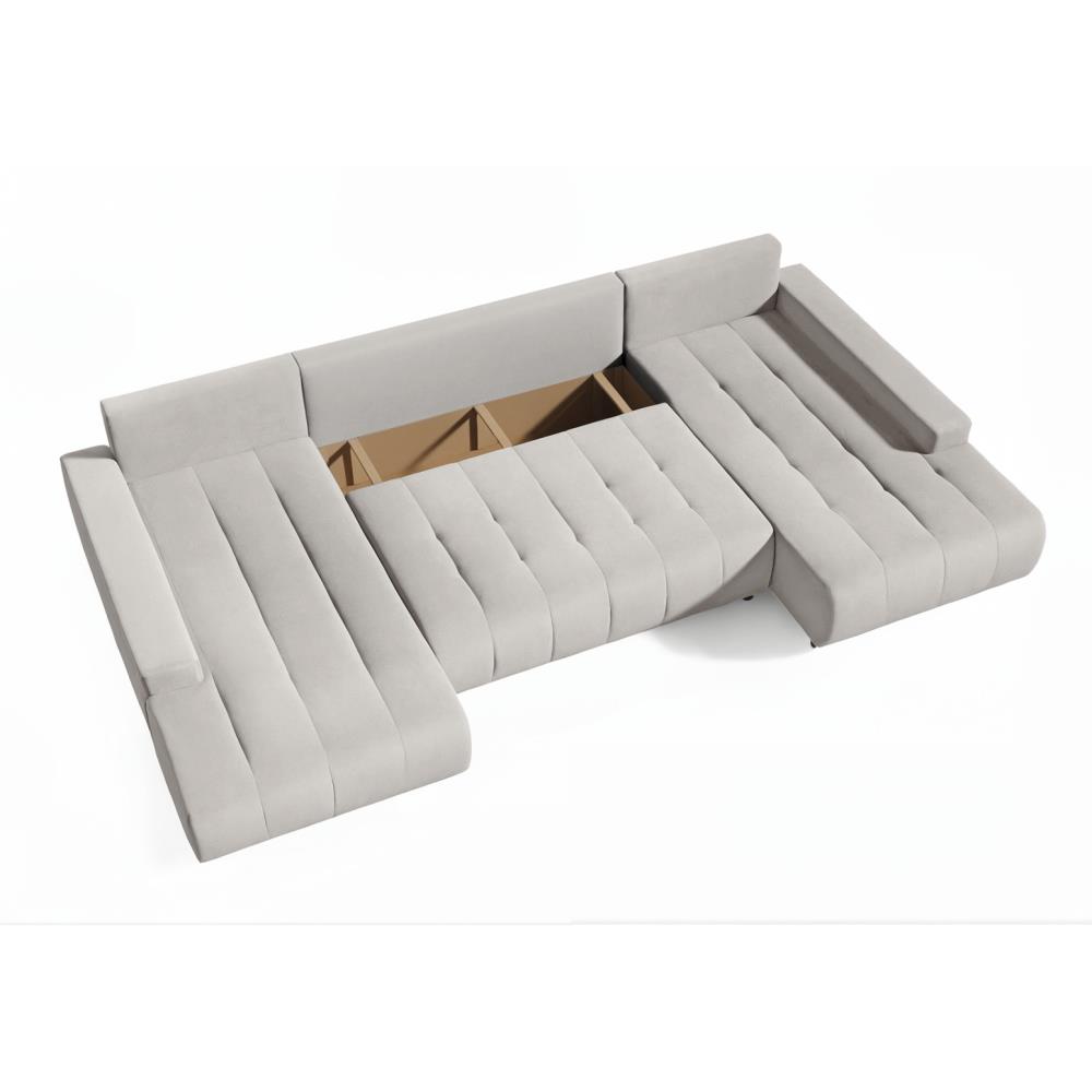 Die Eckcouch verfügt über eine Schlaffunktion, dank der Sie sie ganz einfach in ein bequemes Bett mit einer Fläche von 290 x 140 cm verwandeln können. Zusätzliche Bettwäschebehälter helfen dabei, Ordnung zu halten und bieten Stauraum.
