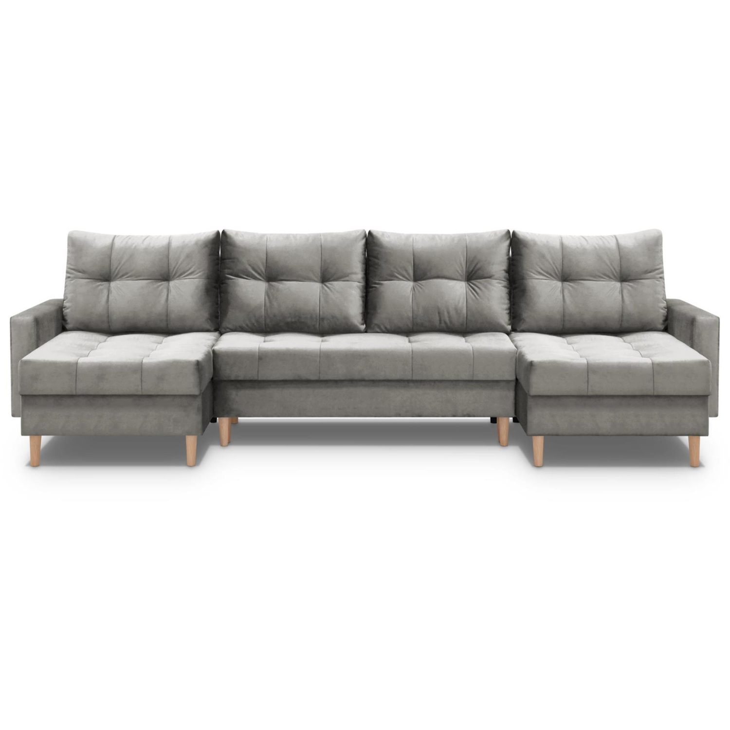 Das gepolsterte U-Form Ecksofa Candi ist ein Wohnzimmermöbel, das im Einklang mit zeitgenössischen Trends entworfen wurde. Es verfügt über 4 große Rückenkissen, dank derer Sie zusätzlichen Seitenhalt auf der Ottomane erhalten können. Die Liegefläche von 270×120 cm eignet sich hervorragend zum Entspannen beim Fernsehen oder für die Arbeit am Laptop in halb zurückgelehnter Position. Die hohen Beine des Ecksofas im typisch skandinavischen Charakter weisen auf seinen modernistischen Stil hin.