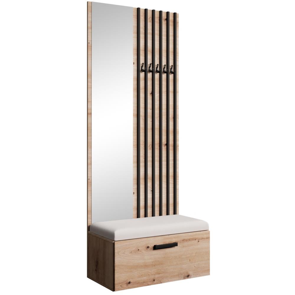 Die moderne Garderobe mit Schuhschrank, Spiegel und Lamellen ist eine stilvolle und funktionale Lösung für deinen Flur. Mit einer Breite von 81 cm bietet sie optimale Organisation, indem sie Platz für Schuhe, Oberbekleidung und Accessoires schafft. Dank der eleganten Lamellen und praktischen Haken kannst du Jacken, Mäntel oder Taschen bequem aufbewahren, während der große Spiegel nicht nur bei der täglichen Vorbereitung hilft, sondern den Raum auch optisch vergrößert.