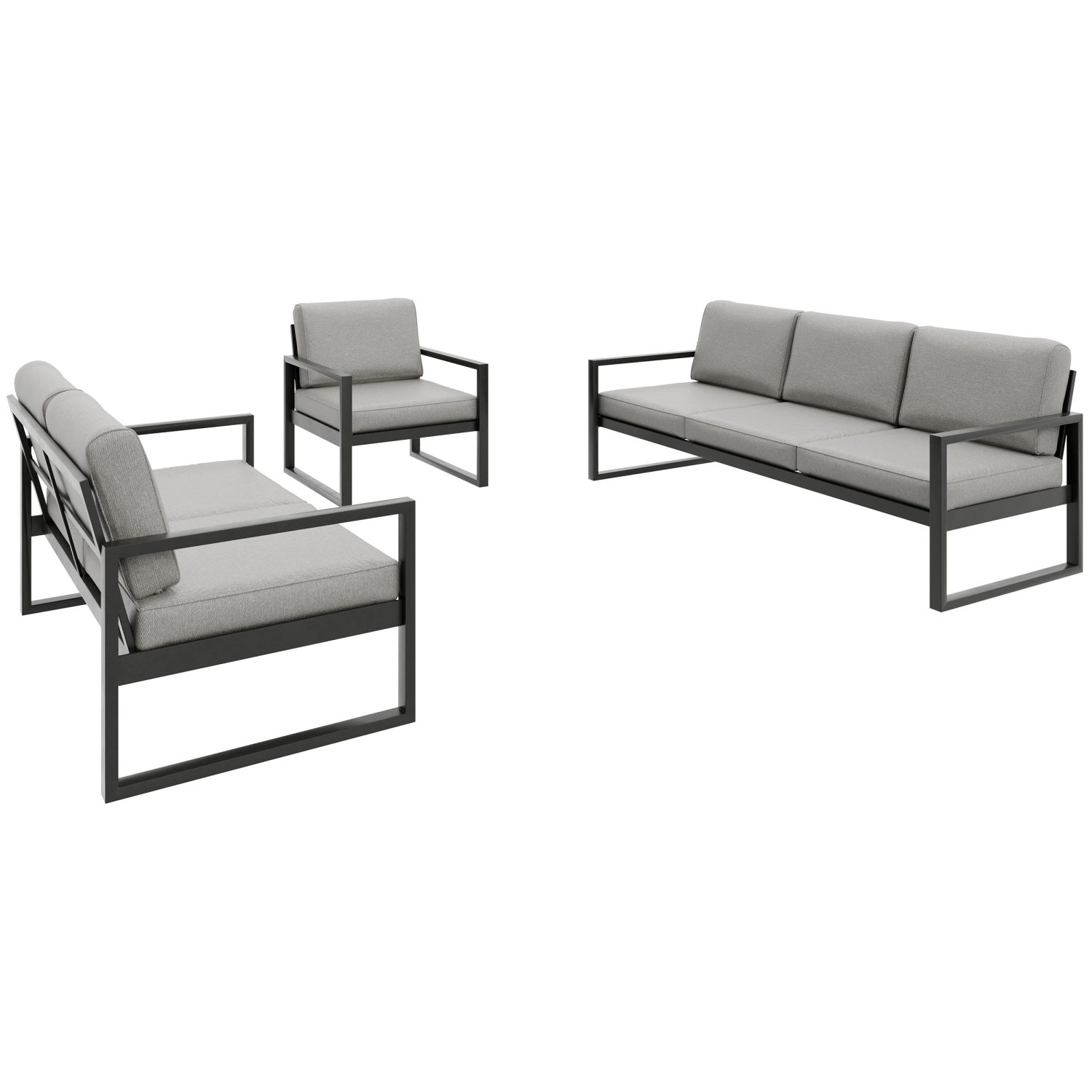 Gartenmöbelgarnitur STELLA mit 3-Sitzer-Sofa, 2-Sitzer-Sofa und Sessel. Modernes Design, Metallgestell und wasserabweisender Patio Base-Stoff.