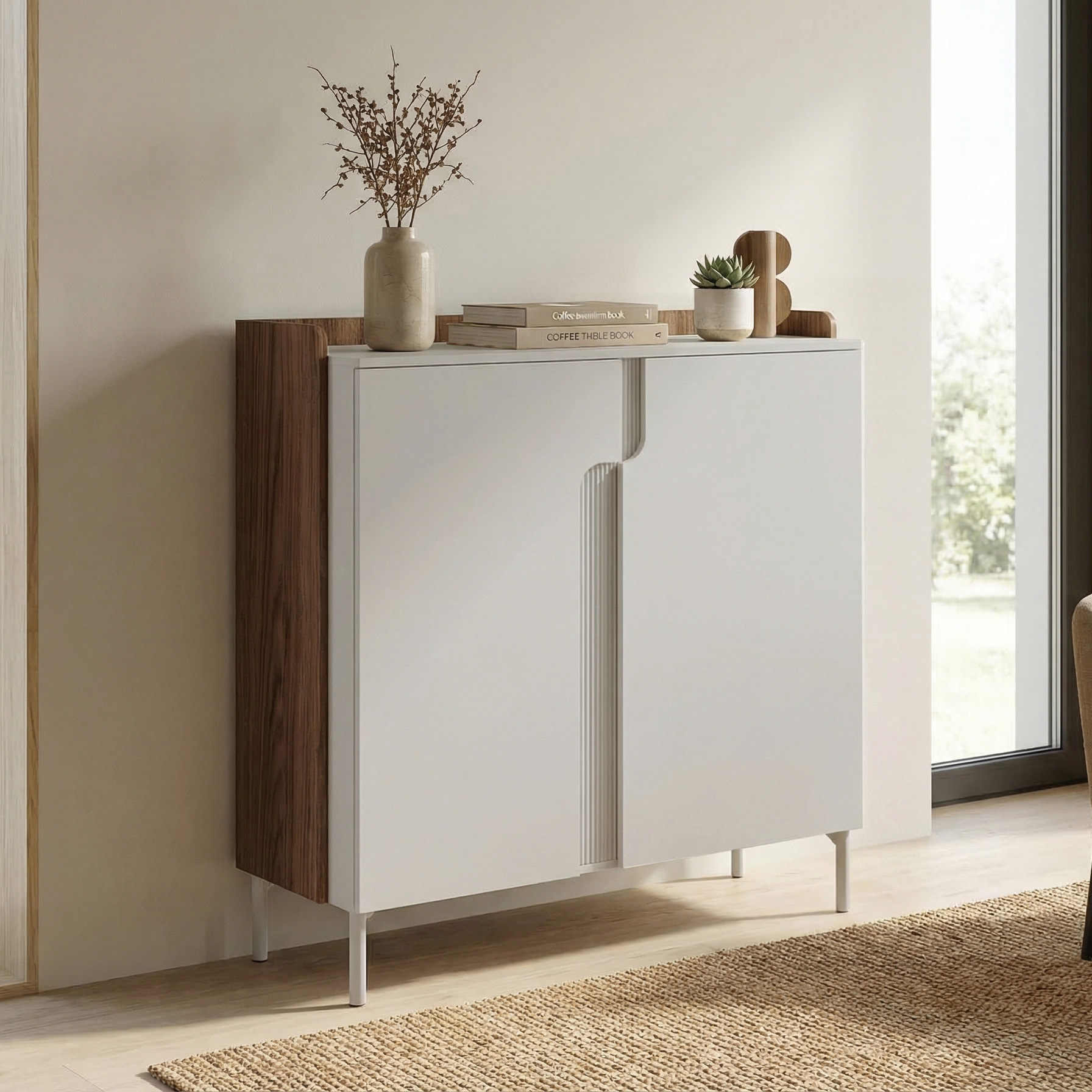 Hinter den 2 Türen verbirgt sich ein durchdacht aufgeteilter Innenraum mit Einlegeböden, der ausreichend Platz für verschiedenste Gegenstände bietet – von Kleidung über Dokumente bis hin zu Alltagsaccessoires.