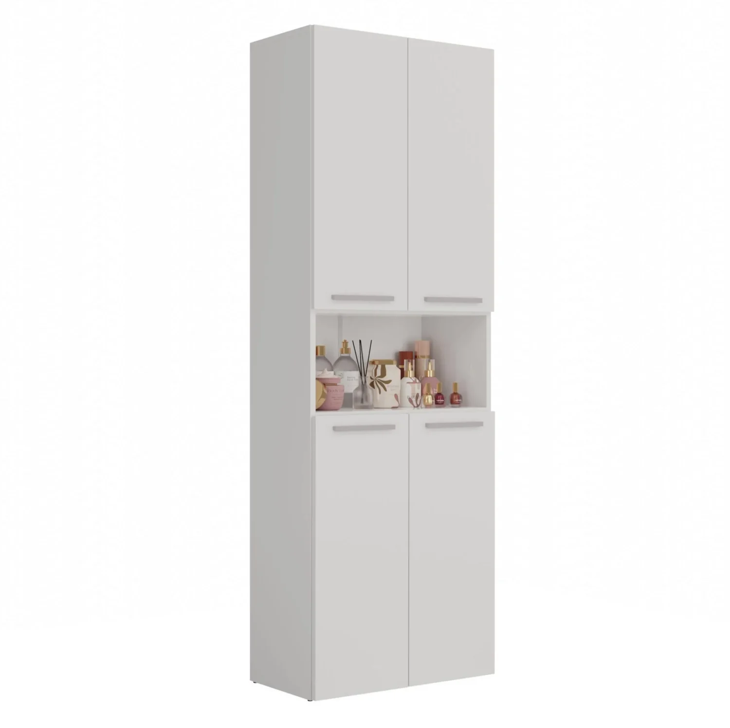 Unser Badezimmerschrank bietet bis zu fünf praktische Einlegeböden, von denen vier abschließbar sind und einer offen bleibt. Ideal für alle, die Wert auf Ordnung legen und das Wesentliche hinter eleganten Türen verstecken wollen, während auf dem offenen Regal dekorative Akzente gesetzt werden.