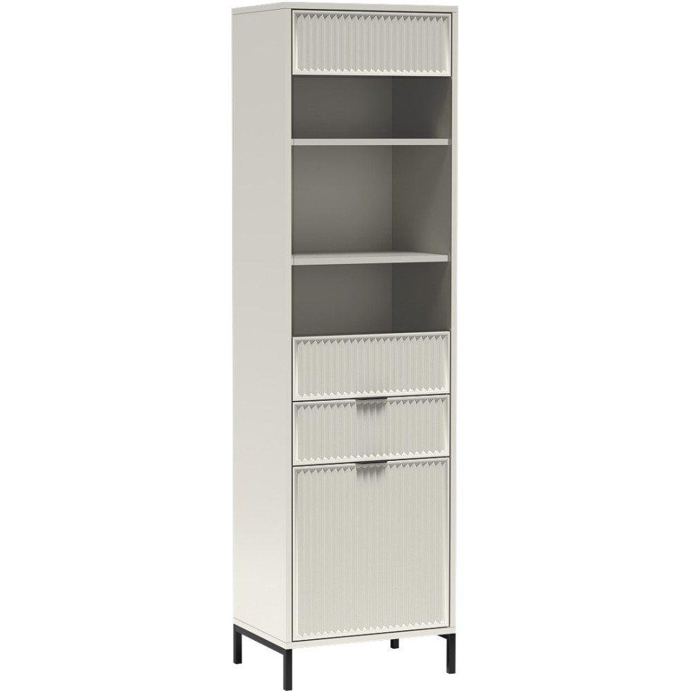Die hohe Vitrine LINNA ist ein wahres Highlight für alle, die moderne Eleganz und durchdachte Funktionalität schätzen. Mit ihrer verglasten Tür, der markanten Riffelstruktur und einer praktischen Schublade im unteren Bereich verbindet sie gekonnt ästhetische Leichtigkeit mit nutzerorientiertem Stauraum.