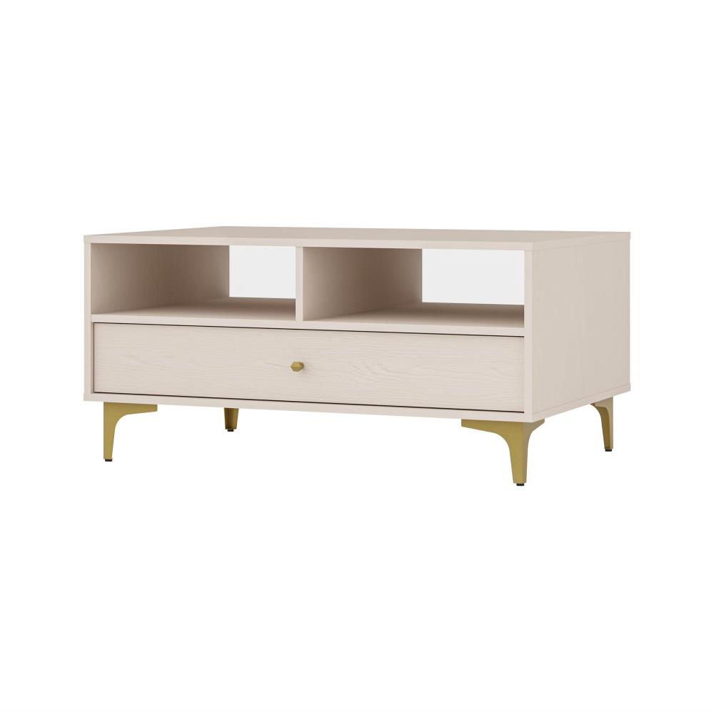 Der Tisch verfügt über eine praktische Schublade, die ideal für die Aufbewahrung von Fernbedienungen, Zeitschriften oder anderen Alltagsgegenständen geeignet ist. Zusätzlich bieten die offenen Regalfächer ausreichend Platz für Bücher, Dekoration oder andere Wohnaccessoires.