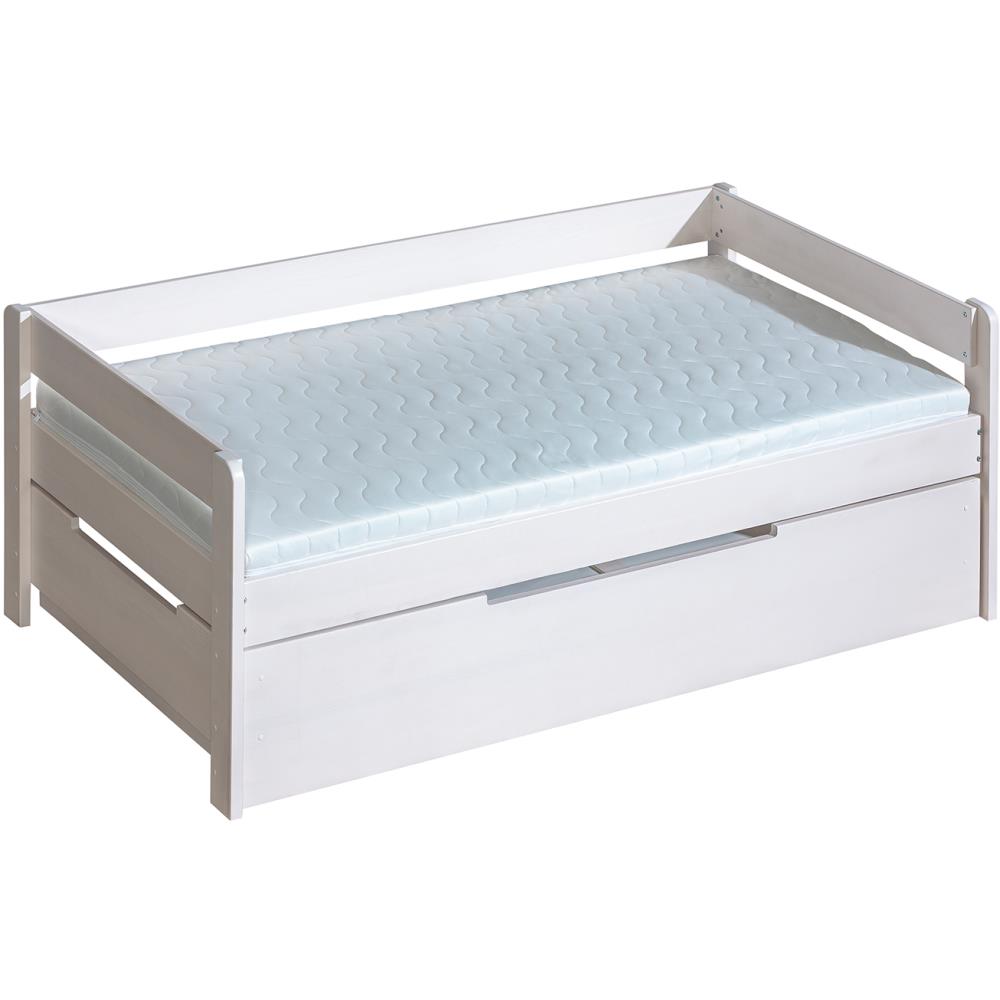 Das Bettgestell aus Holz sorgt für Stabilität und Langlebigkeit, während die zweite, ausziehbare Liegefläche eine praktische Lösung für zusätzlichen Schlafplatz bietet. Die integrierte Konstruktion ermöglicht ein einfaches Herausziehen der unteren Matratze und macht das Bett besonders vielseitig.