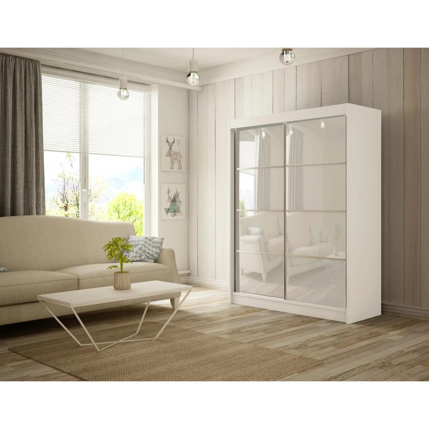 Wir präsentieren Ihnen einen einzigartigen zweitürigen Kleiderschrank Pol III, der Ihrem Raum einen modernen Akzent verleiht. Dieser elegante Kleiderschrank Pol III ist in drei Größen erhältlich: 120 cm, 150 cm und 200 cm, sodass Sie ihn an Ihren Raum und Ihre individuellen Bedürfnisse anpassen können. Die Türen des Schranks Pol III wurden mit einem schönen Möbelglas verziert, das ihm einen einzigartigen Charme und Leichtigkeit verleiht. Das Design des Gehäuses ist robust und langlebig und besteht aus 16 mm Laminatplatte. Das Innere des Schrankes ist unser eigenes Design, das darauf abzielt, den Stauraum optimal zu nutzen.