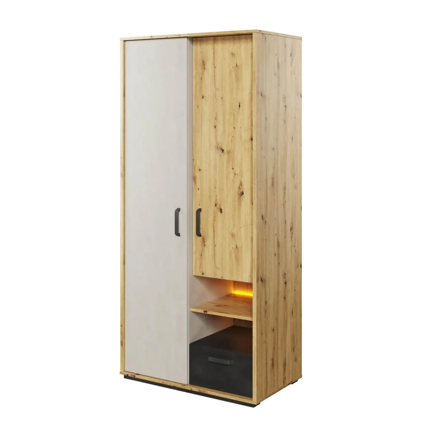 Ein geräumiger Kleiderschrank mit einer interessanten funktionellen Aufteilung. Sie finden eine Stange, an der Sie Kleidung in verschiedenen Längen aufhängen können. Über der Stange ist ein Regal angebracht, während Sie am unteren Ende des Schranks Schuhe in Kartons oder kleine Sportgeräte unterbringen können. Der zweite Teil verfügt über einen abschließbaren Raum mit vier Einlegeböden sowie eine leicht zugängliche Schublade für kleine Gegenstände. Der moderne Charakter des Schranks wird durch die formschönen Metallgriffe und die niedrigen Stützen noch unterstrichen. Eine LED-Beleuchtung für das Möbel ist im Lieferumfang enthalten. Das Möbelstück ist aus strapazierfähiger laminierter Platte gefertigt und mit einer haltbaren ABS-Kantenumleimung versehen.