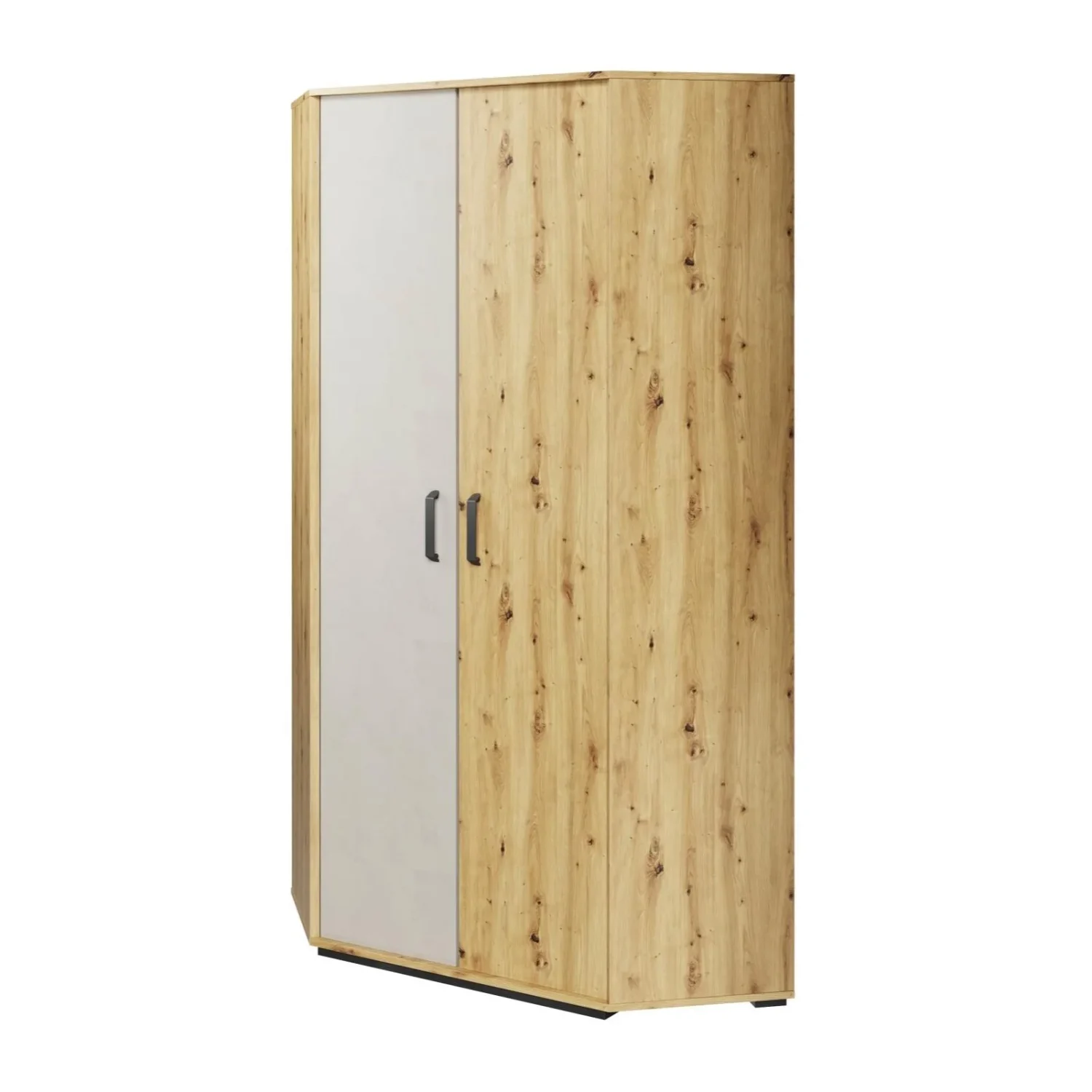 Die Eckgarderobe ist eine großartige Idee, um den Platz in der Ecke eines Zimmers zu nutzen. Die QUBIC Eckgarderobe bietet Platz für eine große Menge an Garderobe, Schuhen sowie Handtaschen und Rucksäcken. Zwei praktische Stangen ermöglichen das bequeme Aufhängen von Kleidung unterschiedlicher Länge. Zwei Einlegeböden im Innenraum ermöglichen die bequeme Aufbewahrung von Kleidung und anderen Accessoires. Zusätzlicher Platz im unteren Bereich des Schranks kann genutzt werden, um z.B. Schuhkartons oder Sportgeräte bequem zu verstauen. Das Möbelstück ist aus strapazierfähiger laminierter Platte gefertigt und mit einer haltbaren ABS-Kante versehen.