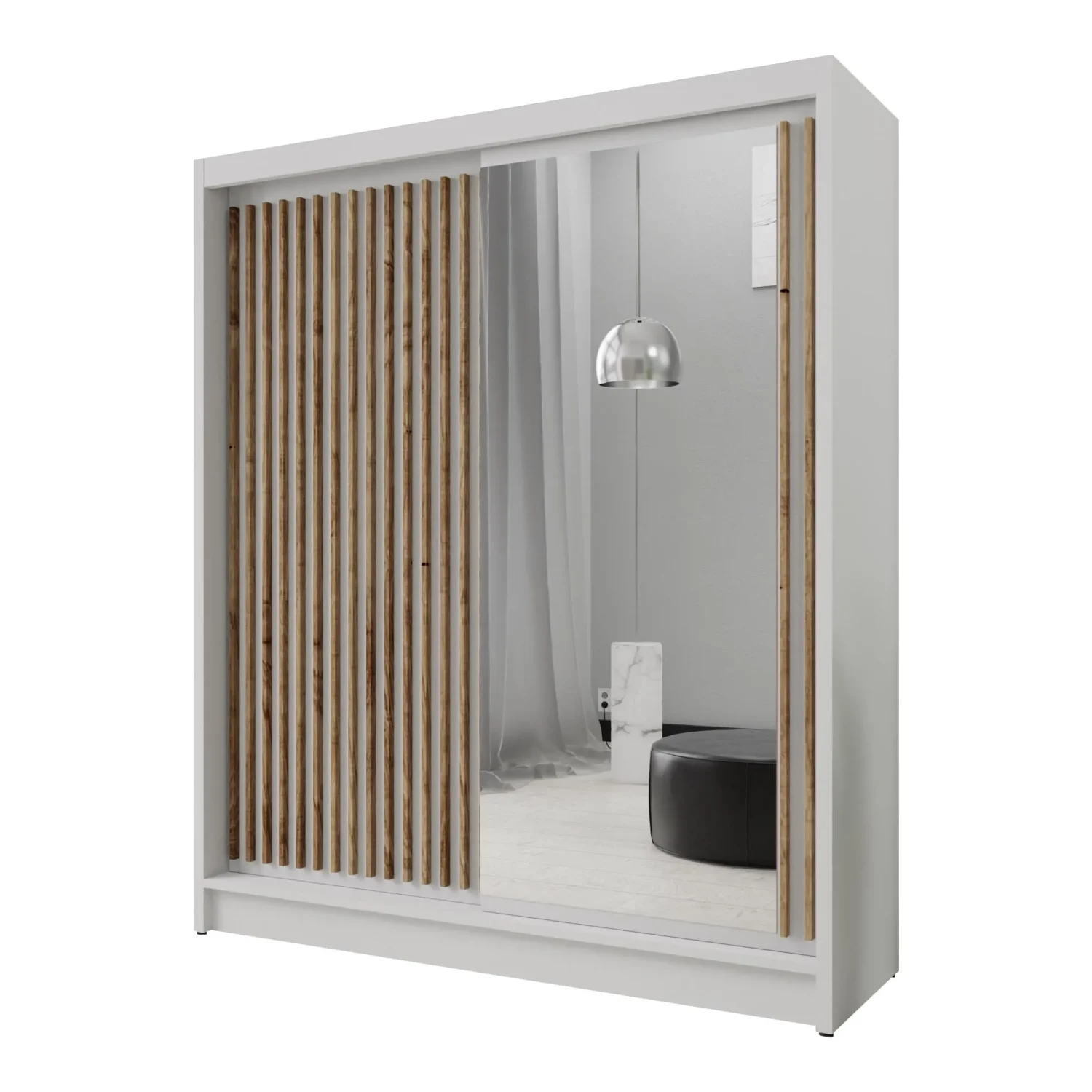 Das Besondere an diesem Modell sind die markanten senkrechten Lamellen in edler handwerklicher Eichenfarbe, die der weißen Oberfläche einen einzigartigen Charakter verleihen. Innen bietet der Schrank großzügigen Platz mit Regalen und einer Kleiderstange, perfekt zum Aufbewahren von Kleidung, Schuhen und Accessoires.