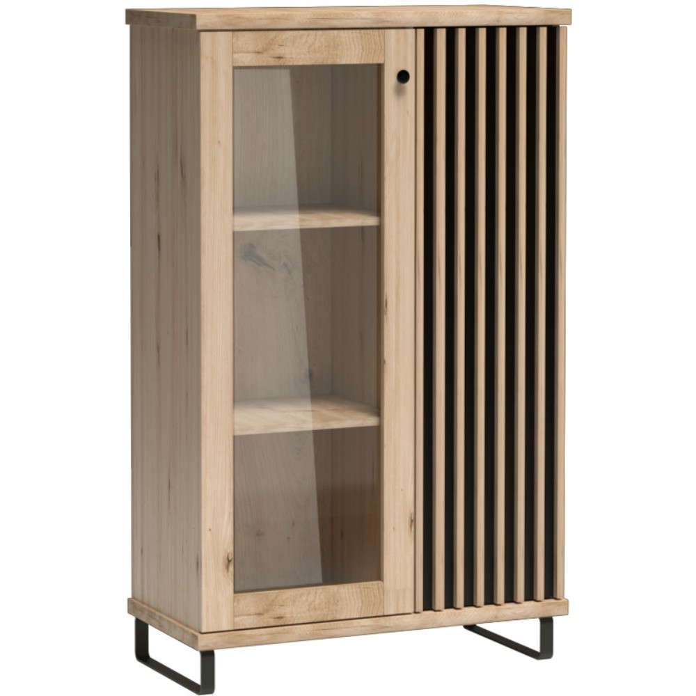 Die niedrige Vitrine CAYA ist die perfekte Wahl für alle, die stilvolle Aufbewahrung mit moderner Ästhetik kombinieren möchten. Mit ihrer kompakten Form eignet sie sich ideal für kleinere Wohn- oder Essbereiche, ohne dabei auf Eleganz zu verzichten. Die Kombination aus Artisan Eiche und mattem Schwarz schafft ein trendiges Loft-Flair und passt zu verschiedensten Einrichtungsstilen.