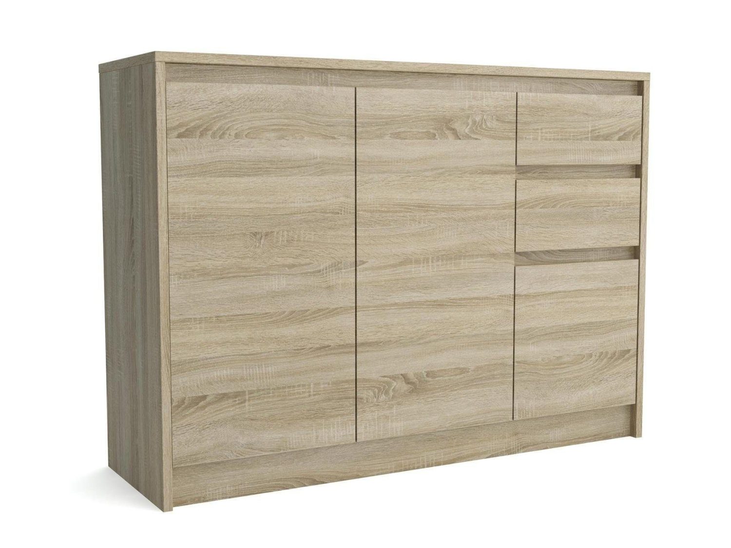Die stilvoll Holzkommode ANTHONY in 3 Türen und 2 Schubladen Konfiguration ist eine ausgezeichnete Lösung für diejenigen, die mehr Stauraum benötigen. Es ist in den Farben weiß, schwarz oder eiche Sonoma erhältlich und sein modernes Design wird sicherlich Aufmerksamkeit erregen.