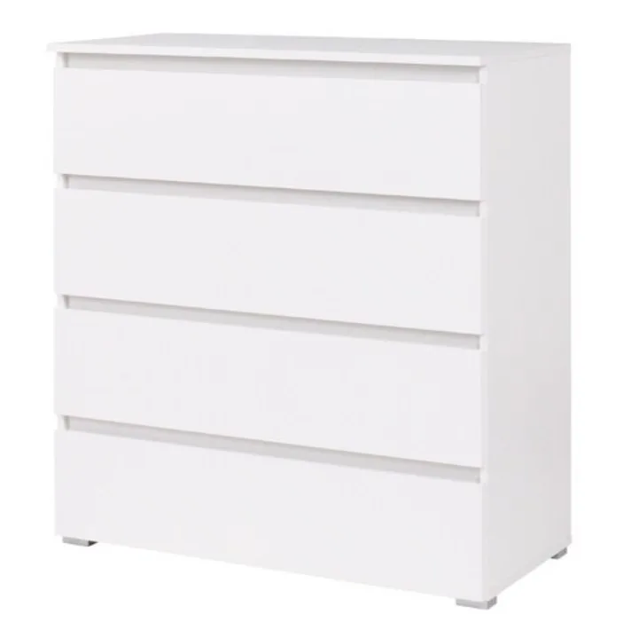 Die Kommode Cosmo C04 besteht aus vier Schubladen. Die Möbel wurden aus einer hochwertigen laminierten Platte mit erhöhter Widerstandsfähigkeit gegen Kratzer und Beschädigungen hergestellt. Darüber hinaus wurden die Kanten des Möbels mit ABS-Kanten geschützt. Cosmo ist ein modernes System für jeden jungen Menschen. Grifflose Fronten erleichtern den Alltag und erfordern keinen großen Kraftaufwand. Sowohl die Front als auch der Korpus sind aus hochwertiger, 16 mm starker Schichtstoffplatte gefertigt. Ein weiterer Vorteil ist die Möglichkeit, zwischen drei Dekoren zu wählen: weiß, Eiche sonoma, Eiche riviera.