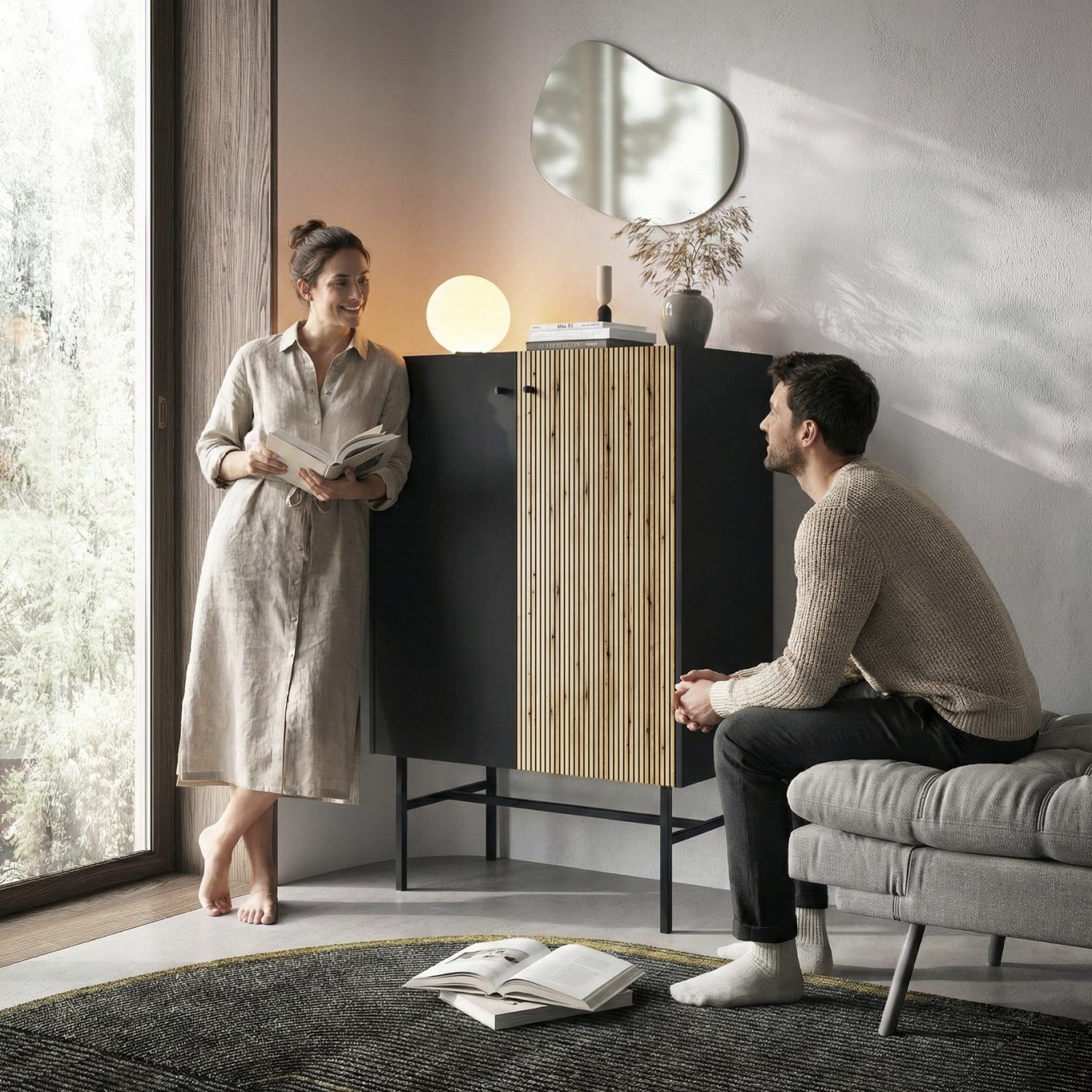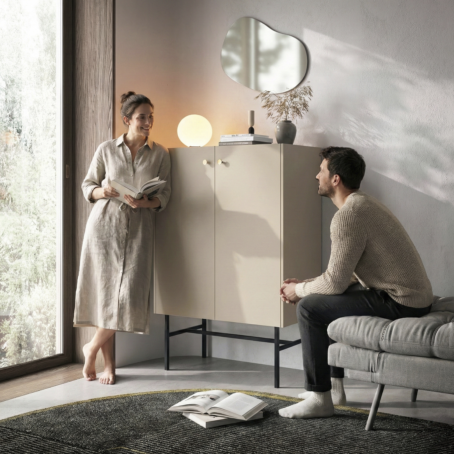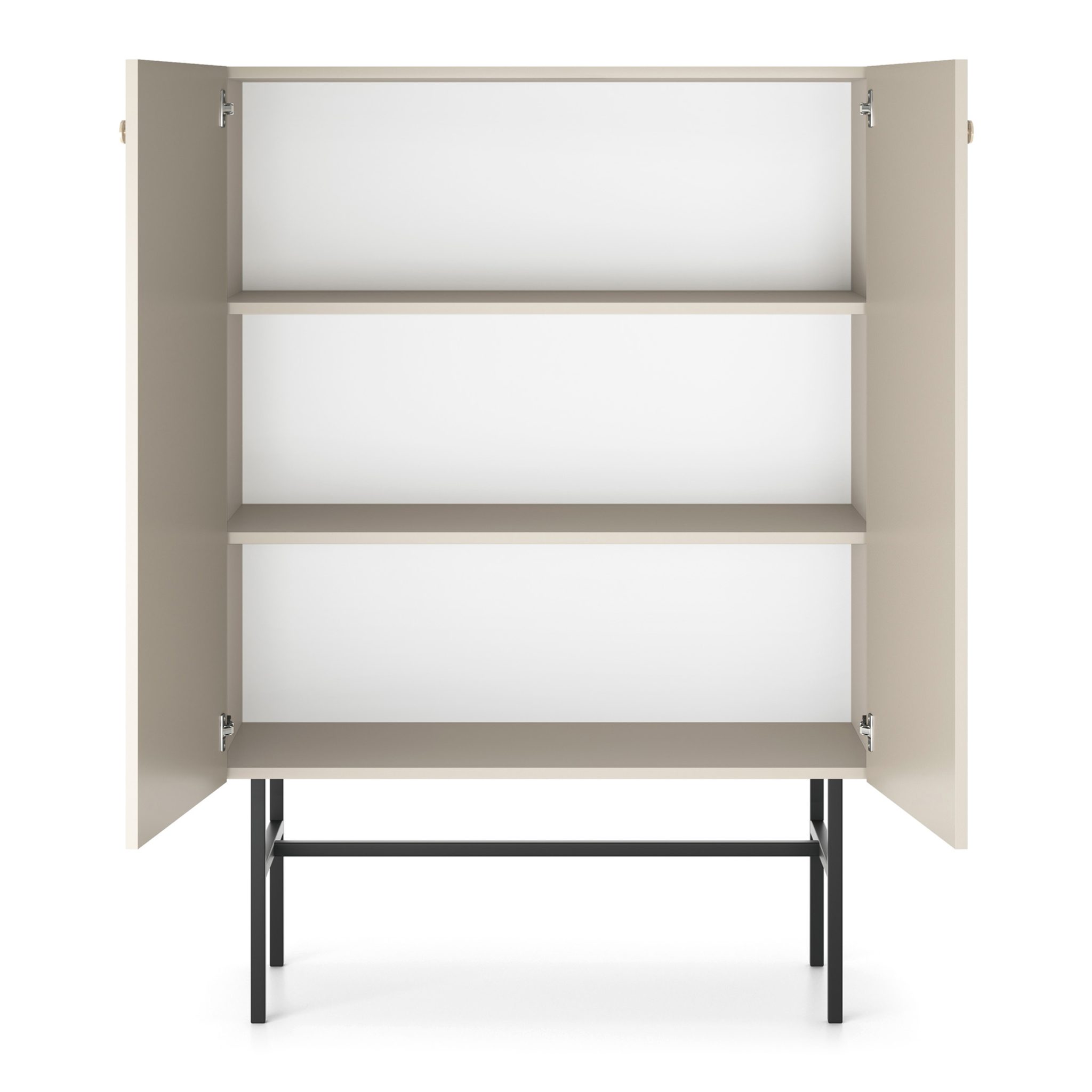 Die Kommode mit zwei Schränken ist ideal für Menschen, die Einfachheit, Funktionalität und modernes Design schätzen. Ihre geometrische Form ruht auf hohen, schwarzen Metallbeinen, was dem Möbelstück Leichtigkeit verleiht und es perfekt in aktuelle Einrichtungstrends einfügt.