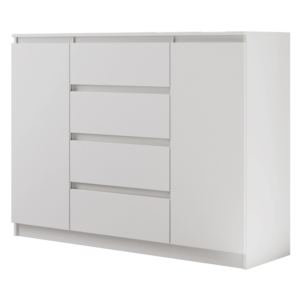 Moderne Kommode LEMON mit 4 Schubladen und 2 Türen in Weiß matt. Praktischer Stauraum, solide Verarbeitung und zwei Breiten zur Auswahl.