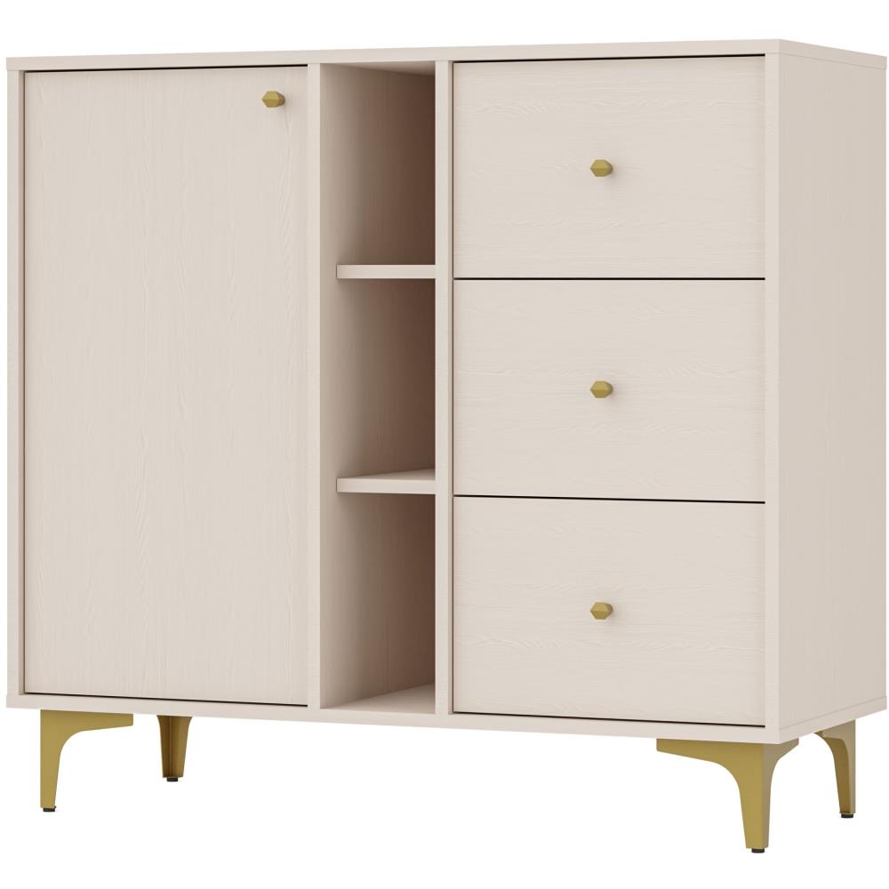 Diese Kommode bietet durch ihre drei Schubladen, eine geschlossene Schranktür und eine offene Ablage vielseitige Stauraumoptionen. Die Schubladen sind ideal für kleinere Gegenstände wie Accessoires oder Unterlagen, während die geschlossene Schranktür zusätzlichen Platz für größere Gegenstände wie Kleidung oder Haushaltsgegenstände bietet. Die offene Ablage ist perfekt für dekorative Elemente oder häufig genutzte Gegenstände, die leicht zugänglich sein sollen.