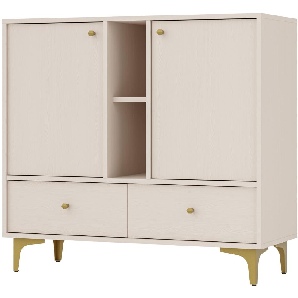 Die Kommode überzeugt durch ihre praktische Aufteilung mit zwei Schubladen, zwei Schranktüren und einer offenen Ablage. Die Schubladen bieten idealen Stauraum für kleinere Gegenstände wie Accessoires, Dokumente oder andere persönliche Dinge, während die zwei Schränke hinter den Türen ausreichend Platz für Kleidung, Bücher oder Haushaltsgegenstände bieten. Die offene Ablage ist perfekt, um dekorative Elemente wie Vasen, Bilderrahmen oder Bücher stilvoll zu präsentieren.