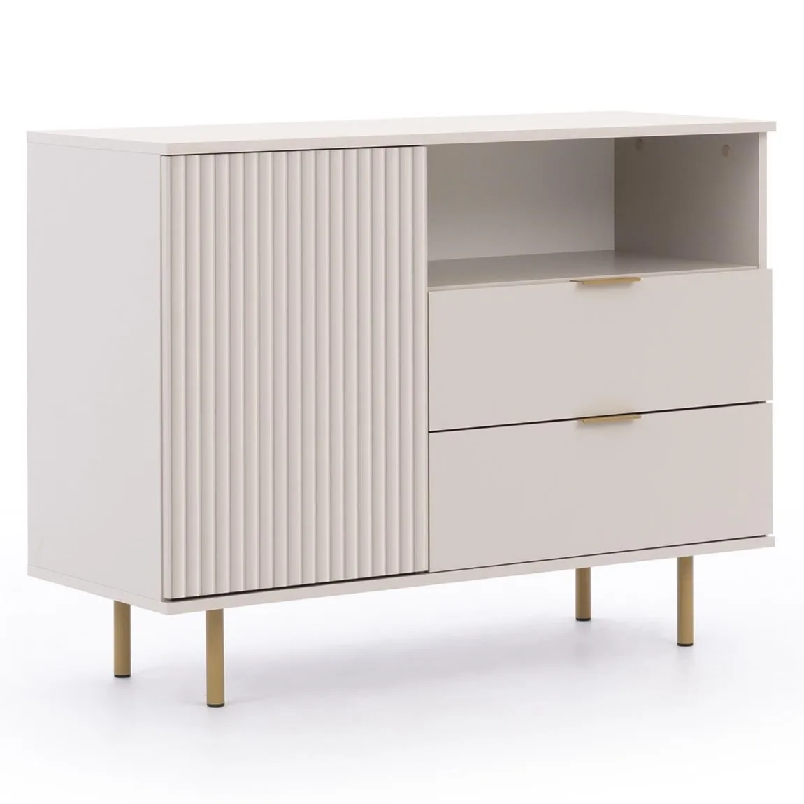 Die Metallfüße sorgen für Leichtigkeit und Modernität und bilden einen Kontrast zu den eleganten, dekorativ gefrästen Türen. Die Türfront wurde sorgfältig mit einzigartigen Fräsungen verziert, die der Kommode einen außergewöhnlichen Charakter verleihen und ihr einzigartiges Design unterstreichen. Zwei Schubladen und ein Einlegeboden bieten viel Stauraum für verschiedene Dinge, während der Schrank mit Türen die ideale Lösung für die Aufbewahrung von Dingen ist, die nicht im Blickfeld sein müssen.