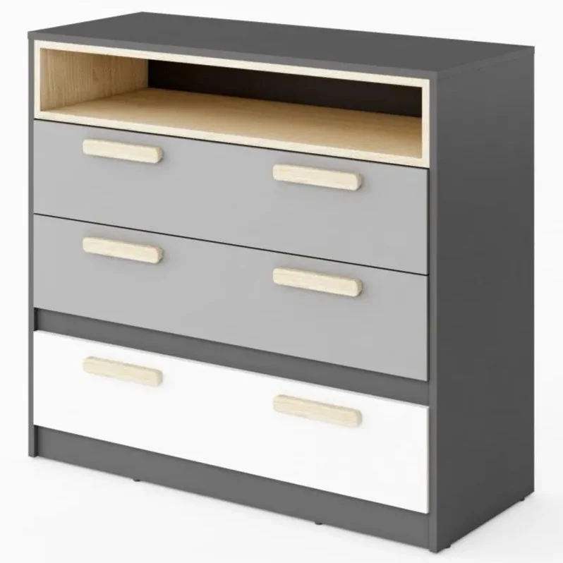 Eine Kommode mit drei geräumigen Schubladen und einer Nische für praktische Kleinigkeiten. Passend für Räume mit schrägen Decken. Das Möbelstück ist aus strapazierfähiger laminierter Platte gefertigt und mit einer dauerhaften ABS-Kantenumrandung versehen. Griffe aus Buchenholz.