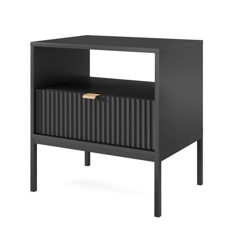 Der Nachttisch Novia ist eine gute Möglichkeit, den Platz in Ihrem Schlafzimmer zu nutzen. Dieses elegante Möbelstück passt problemlos zwischen Bett und Wand und bietet Ihnen zusätzlichen Stauraum für kleine Dinge, die Sie während Ihrer Nachtruhe benötigen. Die Front mit ihren dekorativen Rillen und der geometrische Rahmen aus pulverbeschichtetem Stahl sind die auffälligsten Merkmale. Ergänzt wird das Ganze durch einen goldenen Aluminiumgriff, der dem Möbel einen eleganten Charakter verleiht.