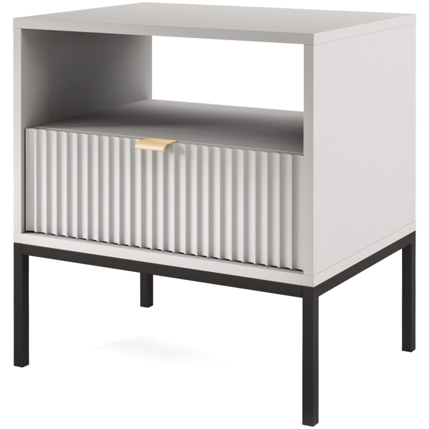 Der Nachttisch Novia ist eine gute Möglichkeit, den Platz in Ihrem Schlafzimmer zu nutzen. Dieses elegante Möbelstück passt problemlos zwischen Bett und Wand und bietet Ihnen zusätzlichen Stauraum für kleine Dinge, die Sie während Ihrer Nachtruhe benötigen. Die Front mit ihren dekorativen Rillen und der geometrische Rahmen aus pulverbeschichtetem Stahl sind die auffälligsten Merkmale. Ergänzt wird das Ganze durch einen goldenen Aluminiumgriff, der dem Möbel einen eleganten Charakter verleiht.