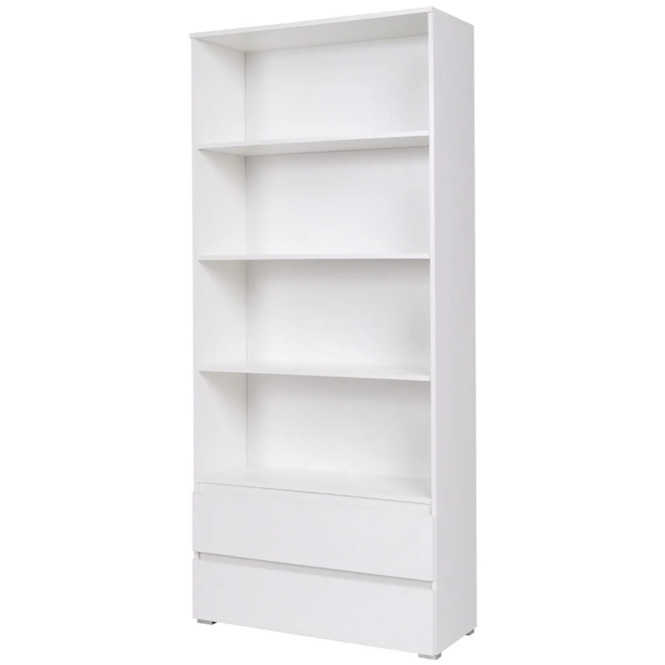 Das breite Bücherregal Cosmo CO3 besteht aus zwei Schubladen und drei offenen Regalen. Das Möbel wurde aus einer hochwertigen laminierten Platte mit erhöhter Widerstandsfähigkeit gegen Kratzer und Beschädigungen hergestellt. Zusätzlich wurden die Kanten des Möbels mit einer ABS-Kante geschützt. Die grifflosen Fronten erleichtern die tägliche Arbeit und erfordern keinen großen Kraftaufwand. Die Front und der Korpus sind aus einer hochwertigen 16 mm starken Schichtstoffplatte gefertigt. Ein weiterer Vorteil ist die Auswahl von drei Dekoren: weiß, Eiche sonoma, Eiche riviera.