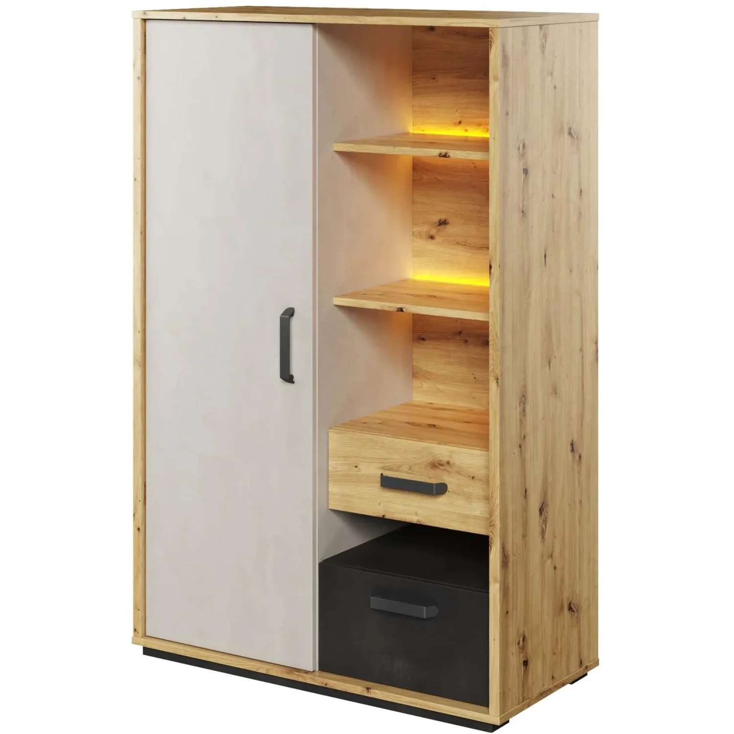 Ein mittelhoher Schrank mit einem separaten Bereich zur Aufbewahrung und Präsentation. Hinter den Schranktüren finden Sie vier praktische Einlegeböden für Kleidung und Schulzubehör. Zwei leicht zugängliche Schubladen machen es einfach, eine Vielzahl von kleinen Gegenständen zu speichern. Der Schrank zeichnet sich durch ein interessantes Design aus – die geometrische Form, die unter dem Korpus versteckten Fronten und die drei Farben – Grau, Holzdekor und Rohstahl – schaffen ein einzigartiges kubistisches Patchwork. Der moderne Charakter des Korpus wird durch formschöne Metallgriffe und niedrige Stützen noch unterstrichen. Eine LED-Beleuchtung für den Korpus ist im Lieferumfang enthalten. Das Möbelstück ist aus strapazierfähiger laminierter Platte gefertigt und mit einer haltbaren ABS-Kantenumrandung versehen.
