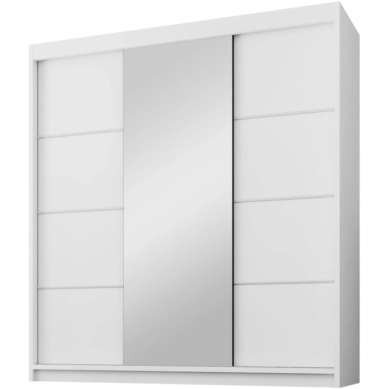 Kleiderschrank in modernem Design Milo besteht aus einer 16 mm starken Schichtstoffplatte. Schrank im modernen Design Milo hat einen Spiegel an der mittleren Tür und die anderen beiden Türen sind aus laminierter Platte. Die Formen sind mit einer rundenden ABS-Kante von 0,5 mm versehen. Der moderne Kleiderschrank Milo bietet viel Stauraum, dank mehrerer Einlegeböden, zwei Kleiderstangen und 4 geräumigen Schubladen.