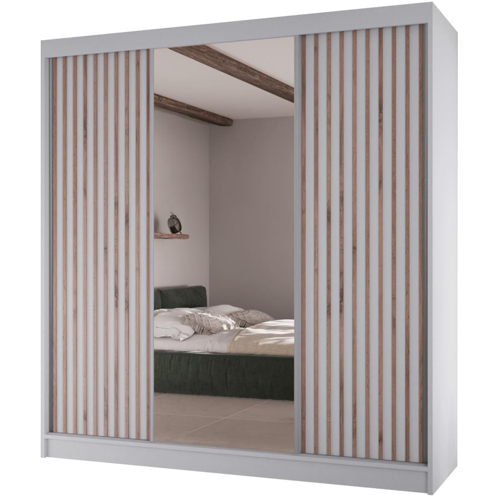 Gefertigt aus einer 16 mm starken, laminierten Platte, die für ihre Kratzfestigkeit und Langlebigkeit bekannt ist, bietet dieser Schrank Stabilität und Qualität für eine langjährige Nutzung. Dieser Schiebetürenschrank vereint Funktionalität mit einem modernen Design und ist die perfekte Wahl für stilbewusste Haushalte.
