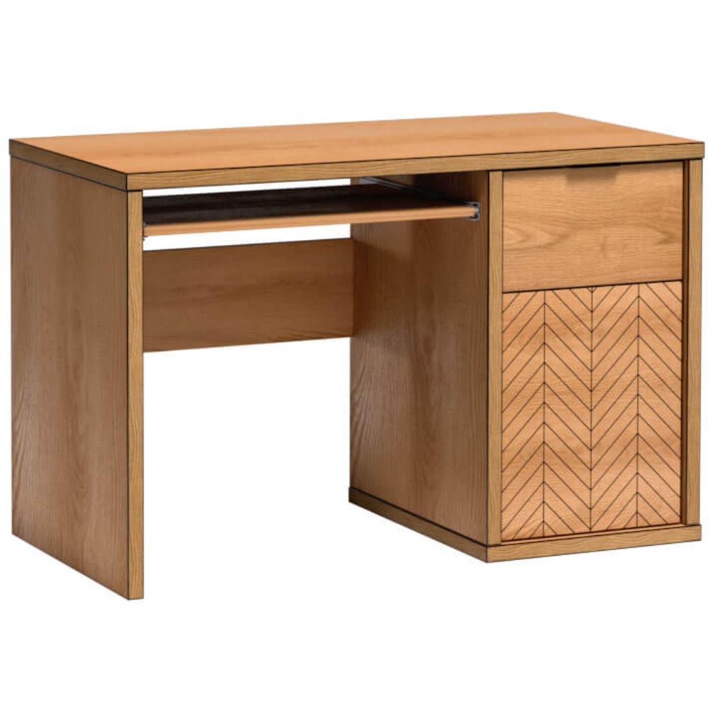 Die ausziehbare Tastaturablage macht den Tisch zur idealen Wahl für die PC-Nutzung und sorgt für eine ergonomische Arbeitsweise. Hinter der rechten Tür befindet sich ein praktisches Innenfach, das zusätzlichen Stauraum für Unterlagen, Zubehör oder Technik bietet.