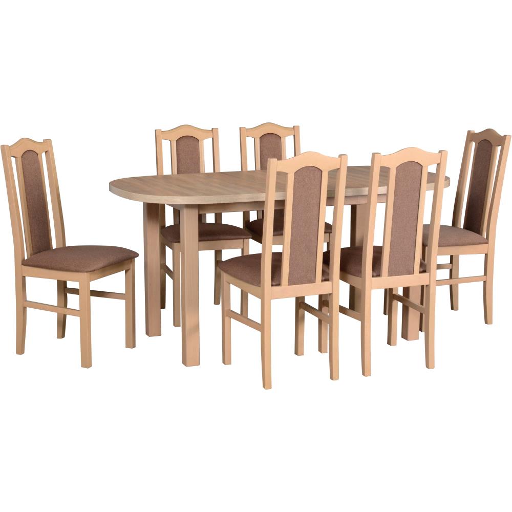 Das Esszimmer-Set BOSS in Eiche Sonoma vereint zeitlose Eleganz mit hoher Funktionalität und sorgt für eine stilvolle Atmosphäre in deinem Essbereich. Der massive Buchenholztisch überzeugt durch seine stabile Konstruktion und eine pflegeleichte Laminat-Tischplatte, die sich ideal für den täglichen Gebrauch eignet. Mit einer Breite von 80 cm und einer variablen Länge von 160 bis 200 cm dank der praktischen Ausziehfunktion bietet der Tisch ausreichend Platz für gemeinsame Mahlzeiten und gesellige Runden. Die sechs dazugehörigen Stühle sind nicht nur optisch ansprechend, sondern auch äußerst komfortabel. Durch die gepolsterte Sitz- und Rückenfläche wird ein angenehmes Sitzgefühl gewährleistet, während die hochwertige Verarbeitung für Langlebigkeit und Stabilität sorgt. Die Stühle sind bereits vormontiert und werden in 2er-Sets pro Karton verpackt, was den Aufbau besonders einfach macht. Mit seinem warmen Eiche Sonoma Dekor fügt sich das Set harmonisch in verschiedene Wohnstile ein und bringt eine gemütliche, natürliche Note in dein Zuhause.