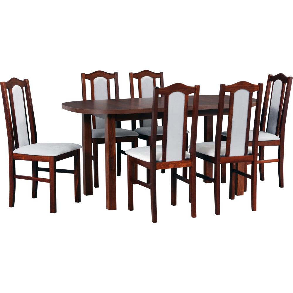 Das Esszimmer-Set BOSS kombiniert zeitlose Eleganz mit Funktionalität und ist die perfekte Wahl für stilvolle Essbereiche. Der aus massiver Buche gefertigte Tisch bietet dank seiner robusten Laminat-Tischplatte eine pflegeleichte und widerstandsfähige Oberfläche. Mit einer Breite von 80 cm und einer variablen Länge von 160 bis 200 cm durch die praktische Ausziehfunktion eignet er sich sowohl für den Alltag als auch für gesellige Abende mit Familie und Freunden. Die sechs dazugehörigen Stühle sind nicht nur optisch ansprechend, sondern auch äußerst komfortabel. Ihre gepolsterte Sitz- und Rückenfläche sorgt für ein angenehmes Sitzerlebnis, während die stabile Konstruktion eine hohe Langlebigkeit gewährleistet. Das Set überzeugt durch seine hochwertige Verarbeitung, zeitlose Optik und die Vielseitigkeit, sich harmonisch in verschiedene Wohnstile einzufügen. Die Stühle sind bereits vormontiert, sodass der Aufbau schnell und unkompliziert erfolgt. Mit dem Esszimmer-Set BOSS holst du dir ein stilvolles und praktisches Möbelstück in dein Zuhause, das den Alltag bereichert und besondere Momente noch schöner macht.