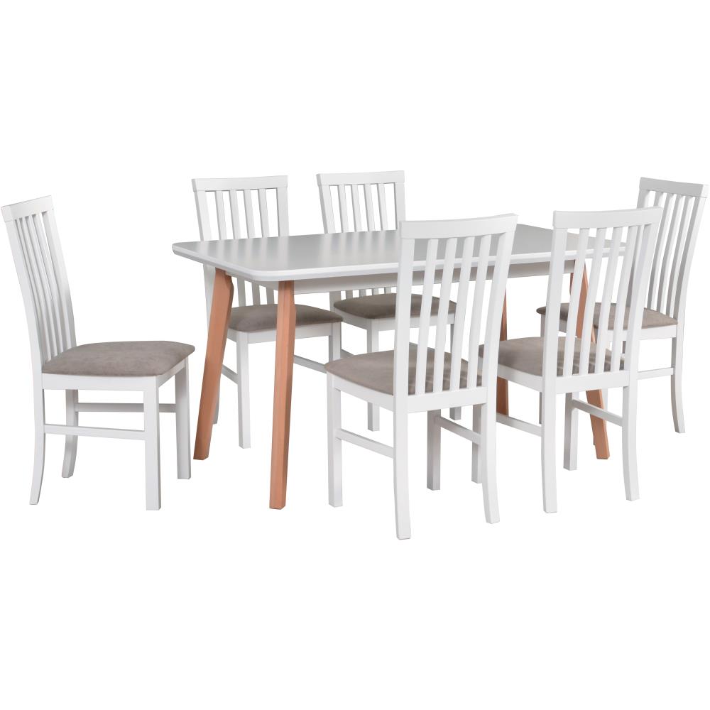 Das Esszimmer-Set OSLO in Weiß & Buche kombiniert skandinavische Schlichtheit mit zeitloser Eleganz. Der Tisch verfügt über eine stabile MDF-Tischplatte, die sowohl langlebig als auch pflegeleicht ist, während die Buchenholzbeine für eine robuste Konstruktion sorgen. Dank der Ausziehfunktion lässt sich die Tischlänge von 160 cm auf 200 cm erweitern, sodass genügend Platz für gemeinsame Mahlzeiten oder gesellige Abende geschaffen wird. Die sechs dazugehörigen Stühle überzeugen mit einer stabilen Buchenholzkonstruktion, die nicht nur für Langlebigkeit sorgt, sondern auch für eine stilvolle Optik. Verpackt in 2er-Sets, sind sie leicht zu transportieren und aufzubauen. Die harmonische Kombination aus Weiß und natürlichem Buchenholz verleiht dem Set eine helle, freundliche Ausstrahlung, die sich ideal in moderne, skandinavische oder minimalistische Wohnstile einfügt. Ein perfektes Ensemble für stilbewusste Haushalte.