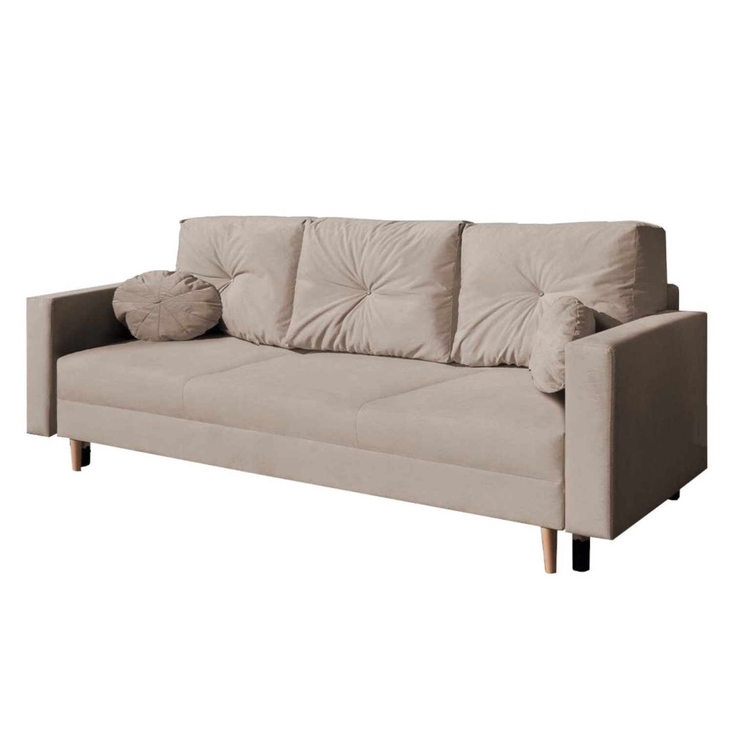 Das Velourssofa 3- Sitzer Milan auf Holzbeinen im skandinavischen Stil? Das Velours Polstersofa Milan wird Ihr Wohnzimmer mit seinem außergewöhnlichen Aussehen perfekt schmücken und die Aufmerksamkeit der Gäste auf sich ziehen. Außerdem können Sie das Veloursschlafsofa Milan jederzeit in ein bequemes Bett mit einer Liegefläche von 195 x 133 cm verwandeln und für Ihre Gäste komfortabel übernachten. Die notwendige Bettwäsche und Textilien können Sie in einem Behälter unter dem Sitz verstecken. Das mit Veloursstoff bezogene Sofa 3-Sitzer Milan hat Wellenfedern und einen Rahmen aus massivem Massivholz. Das Ganze wird durch Holzbeine an der Vorderseite des Sofas ergänzt, die perfekt zum Trinity-Stoff passen.