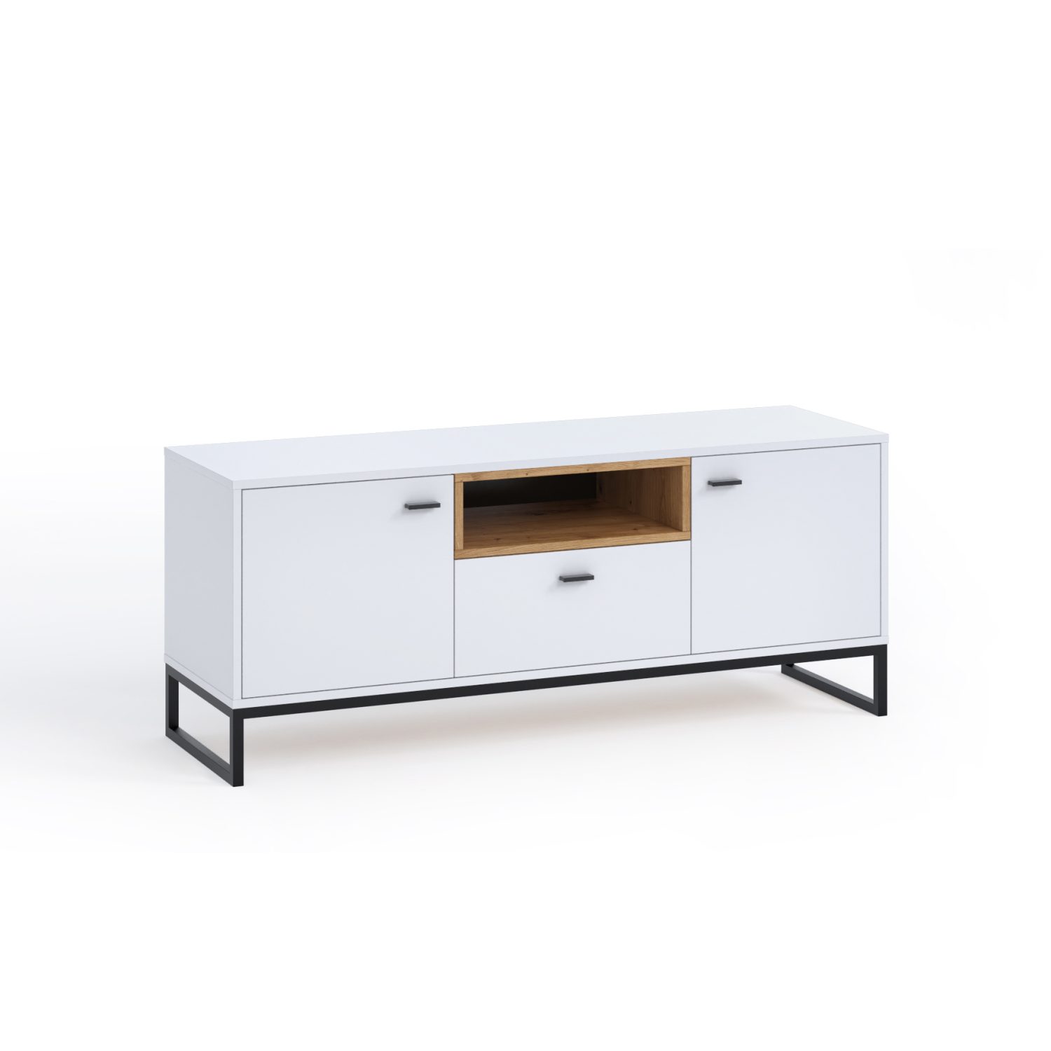 Der TV-Schrank OMAN überzeugt durch sein modernes, minimalistisches Design und seine durchdachte Funktionalität. Mit einer ansprechenden Farbkombination in Weiß oder Eiche Artisan bringt er Natürlichkeit und Eleganz in Ihr Wohnzimmer. Das stabile Metallgestell sorgt für einen modernen Akzent und verleiht dem Möbelstück eine robuste Basis.