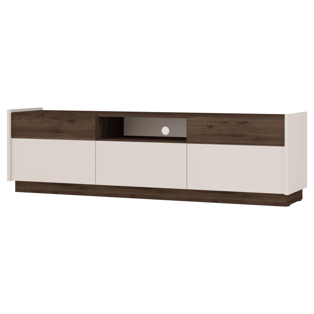 Der TV-Schrank aus der Möbelkollektion Kobe vereint stilvolle Eleganz mit praktischer Funktionalität. Die kontrastreiche Kombination von Okapi-Nussbaum und Sandbeige schafft eine warme, gemütliche Atmosphäre und passt perfekt zu modernen, minimalistischen oder japanischen Einrichtungsstilen. Mit seinen drei geräumigen Schränken bietet dieses Möbelstück nicht nur ausreichend Stauraum für Ihre Elektronik und Zubehör, sondern verleiht Ihrem Wohnraum auch eine harmonische und aufgeräumte Optik.