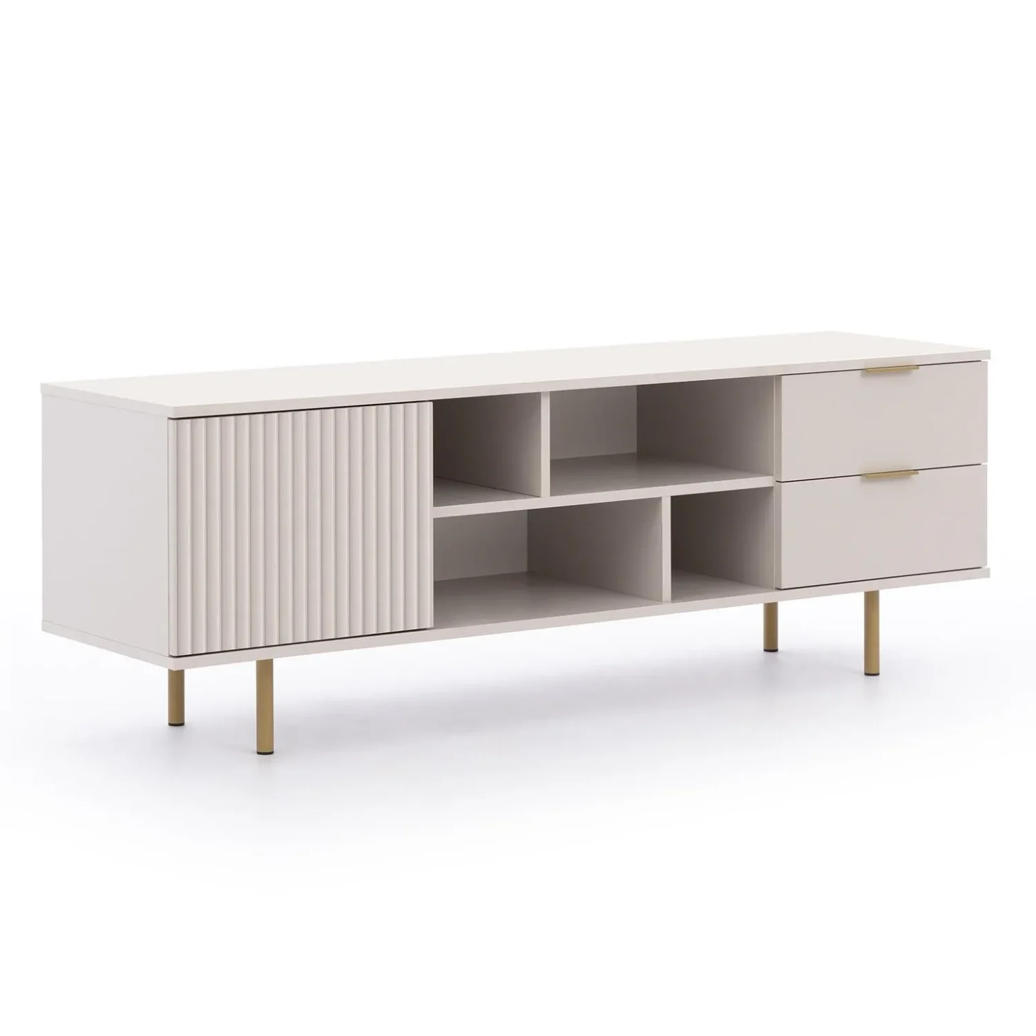 Die Metallbeine verleihen dem Schrank ein leichtes und modernes Aussehen, während sie gleichzeitig einen soliden Halt für Ihre Mediengeräte gewährleisten. Mit seinen kunstvoll gefrästen Türen sieht der RTV-Schrank einzigartig aus und verleiht dem Raum einen raffinierten Touch. Die Türen verdecken das Innere des Schranks und bieten so Platz für eine Vielzahl von Geräten und Zubehör.